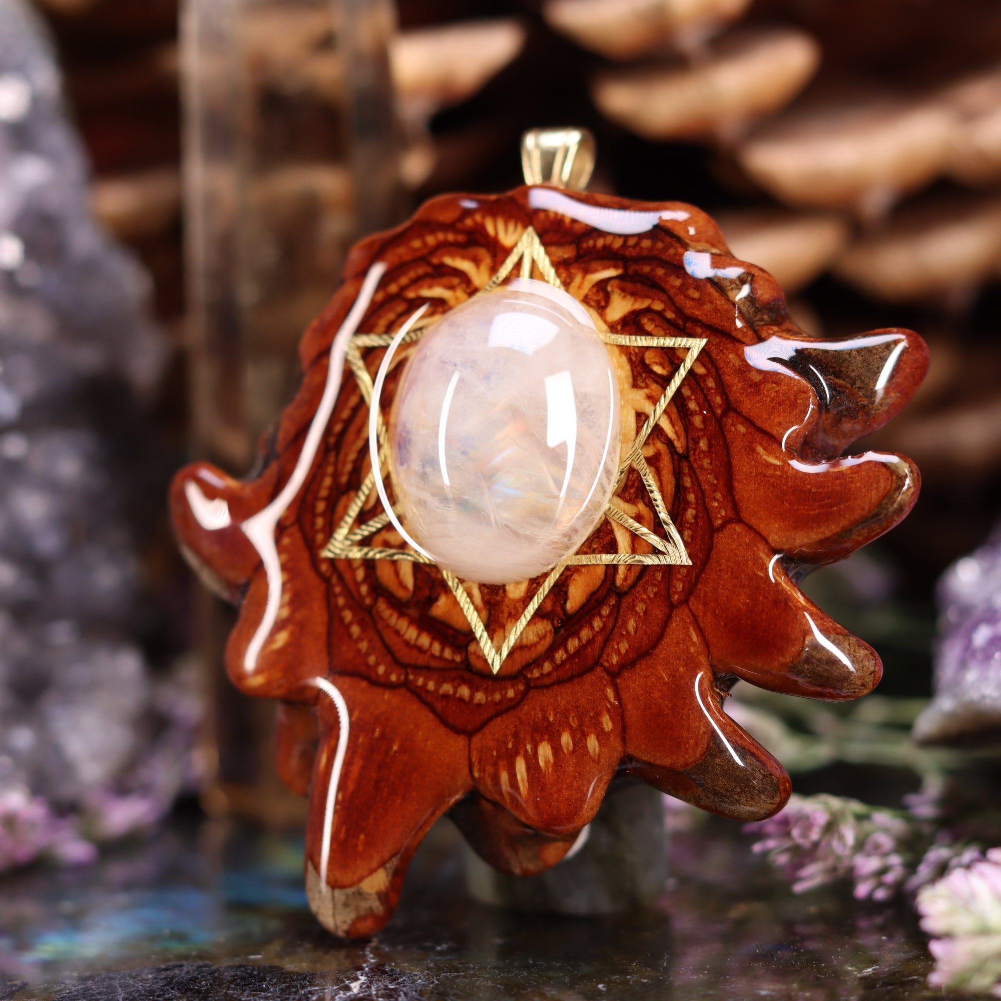Every pinecone pendant is an elegant gift from Mother Nature -- unveiling the ornate Sacred Geometry hidden at the center of one of the world's densest Pinecones. Because only one cross-section is taken from the "heart" of each Cone, every pendant is absolutely unique, and truly one-of-a-kind.