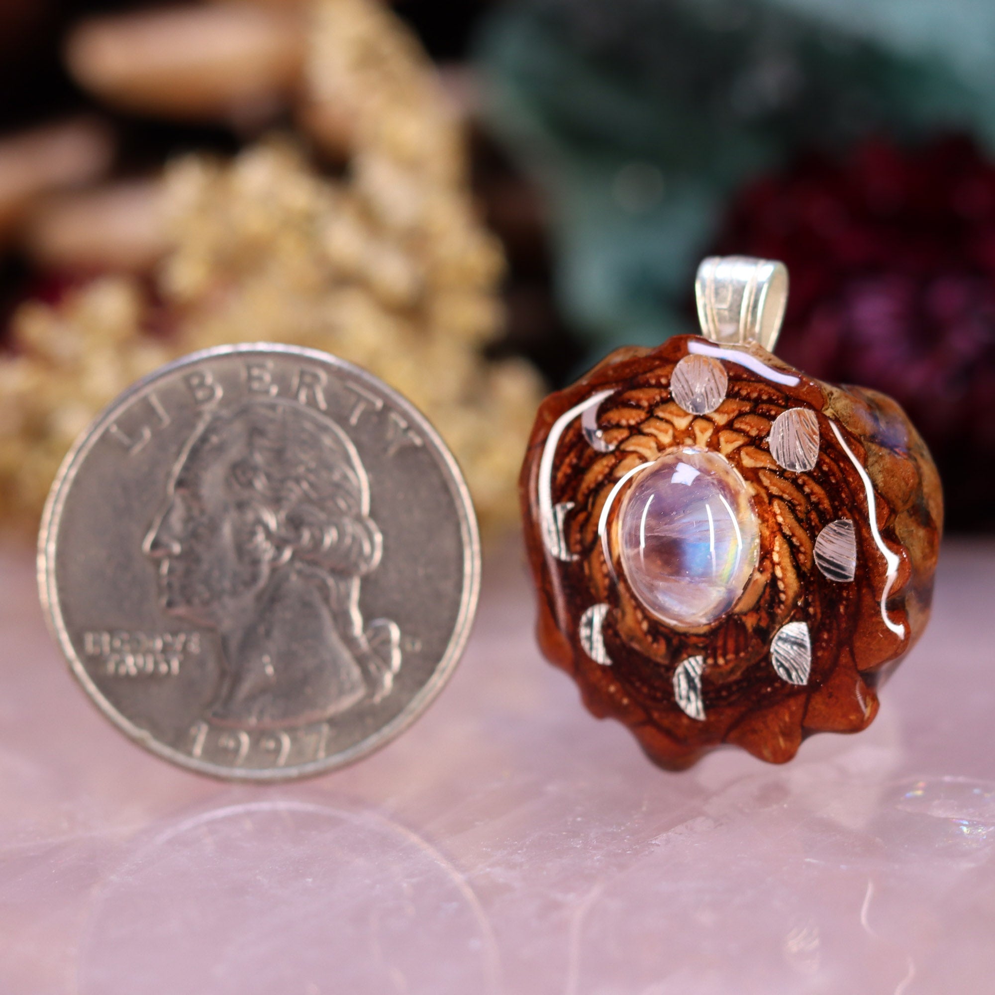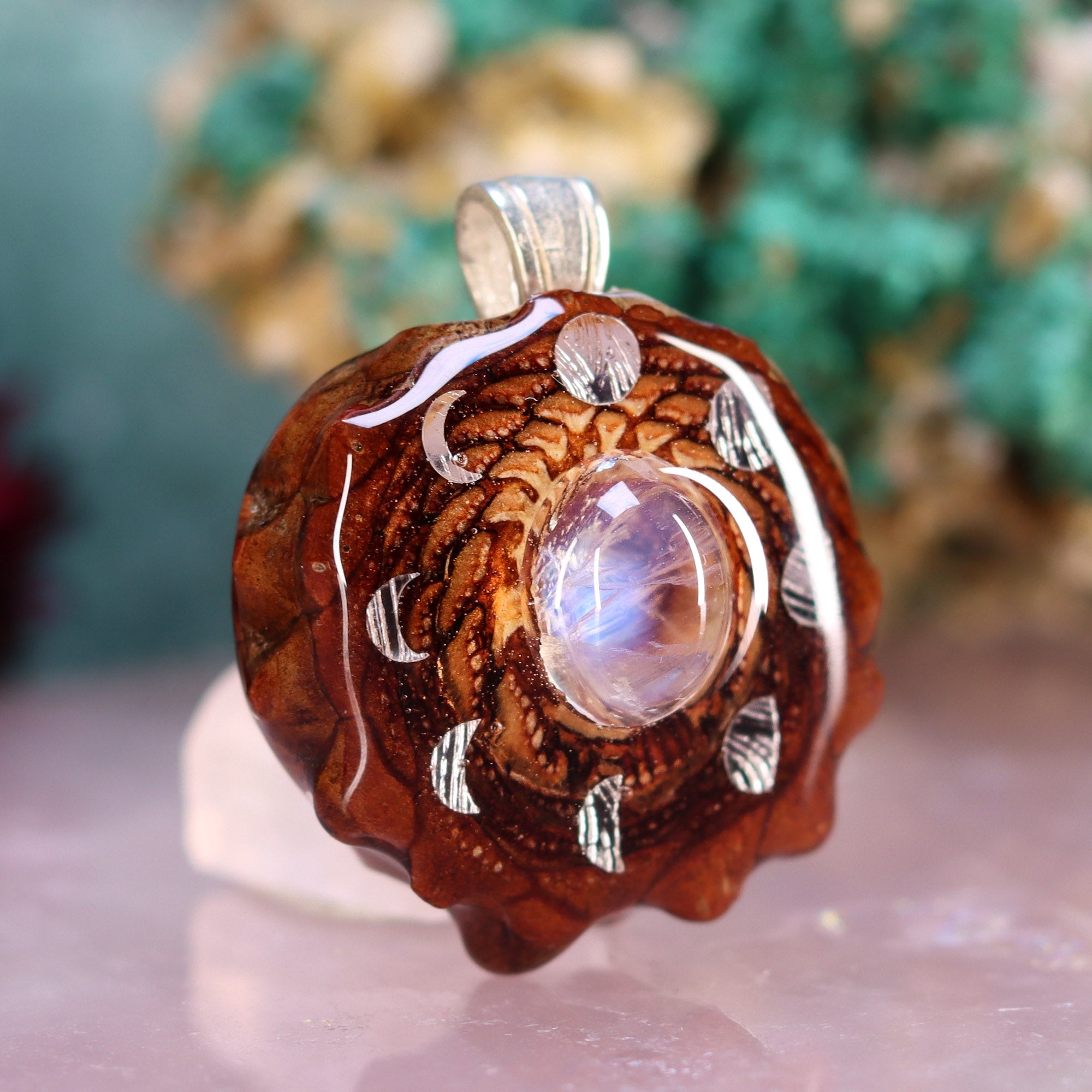 This Pinecone has been blessed with the Moon Cycles, cast in Sterling Silver. The moon has long been held as a sacred symbol for rebirth and change with each phase bringing new opportunities for growth.