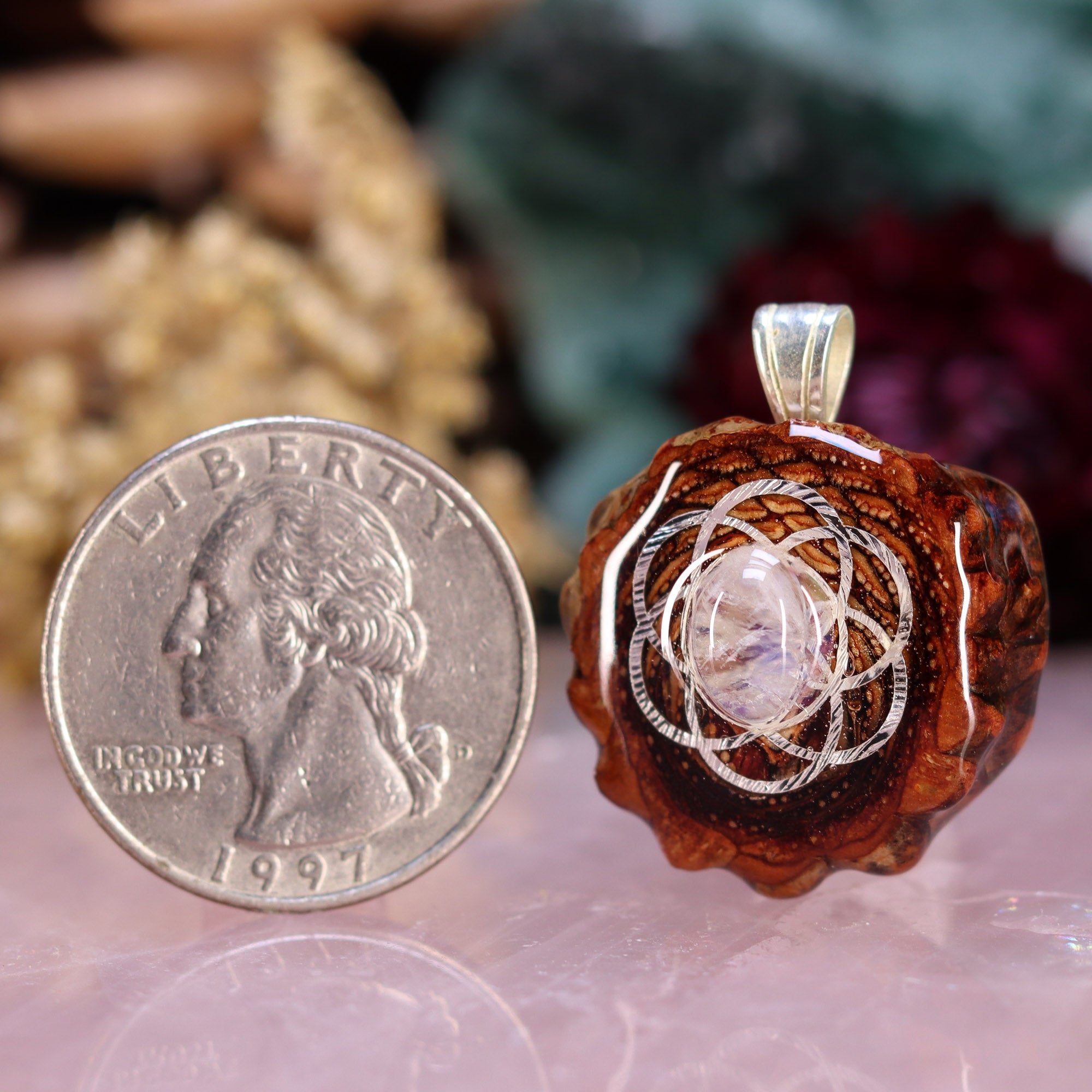 Every pinecone pendant is an elegant gift from Mother Nature -- unveiling the ornate Sacred Geometry hidden at the center of one of the world's densest Pinecones. Because only one cross-section is taken from the "heart" of each Cone, every pendant is absolutely unique, and truly one-of-a-kind.