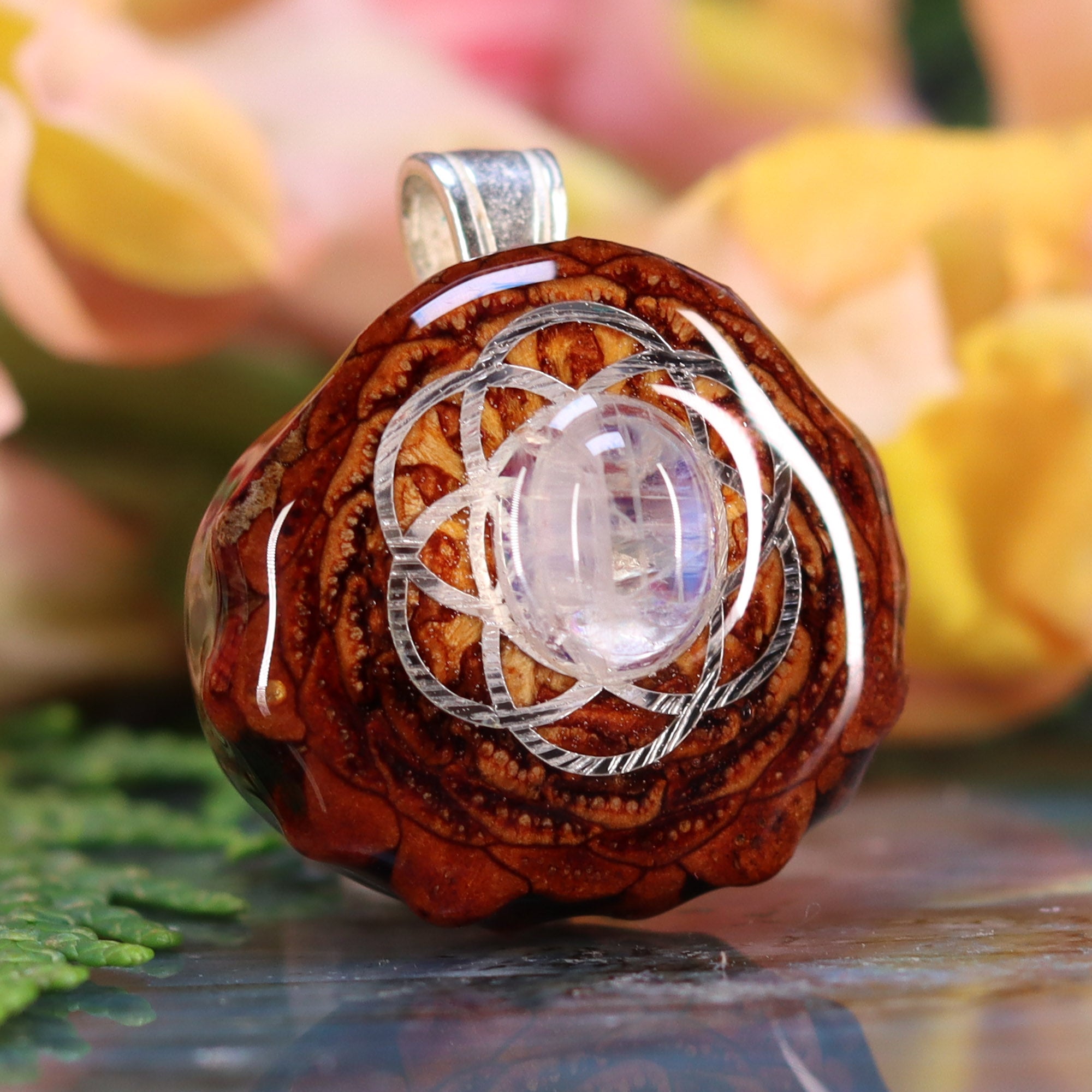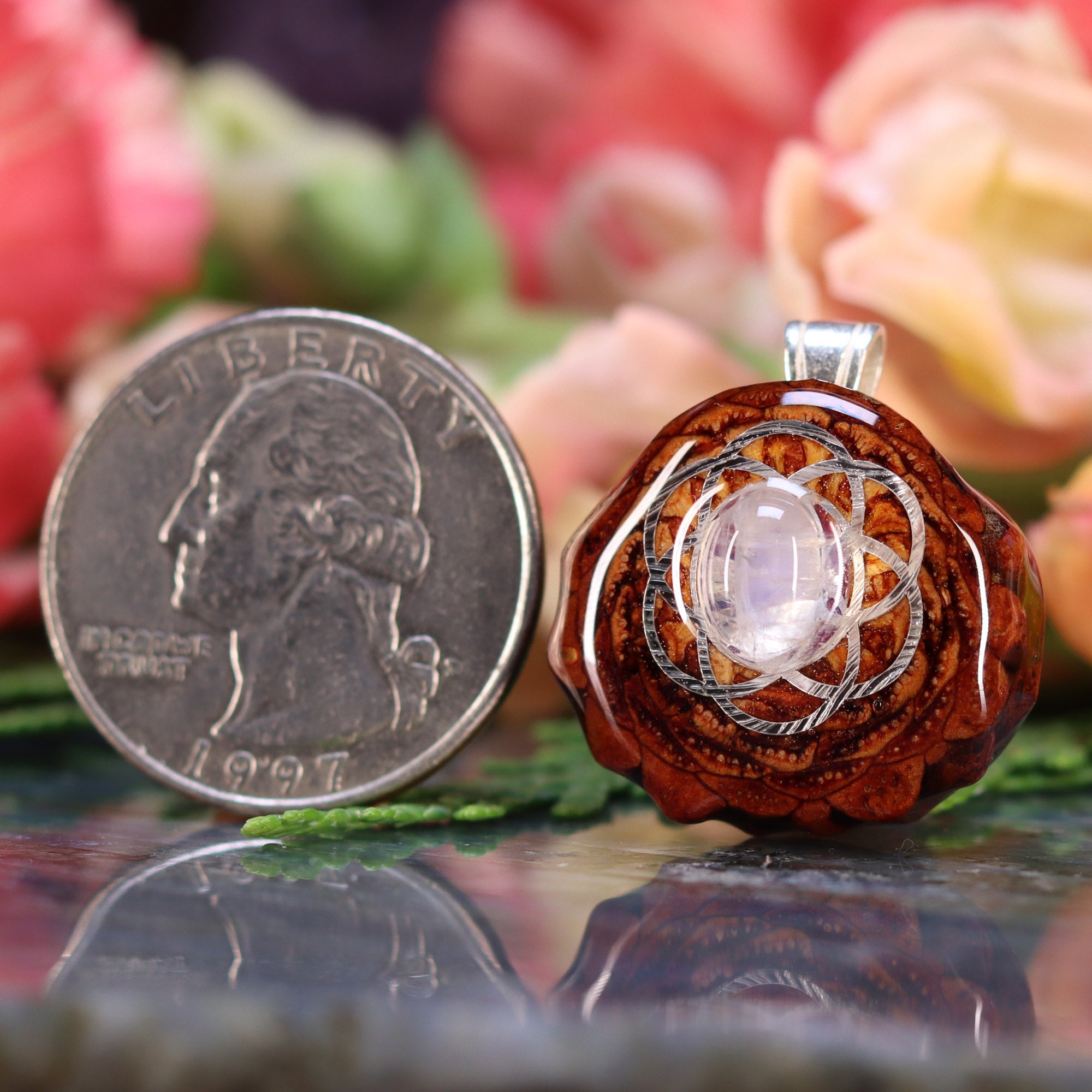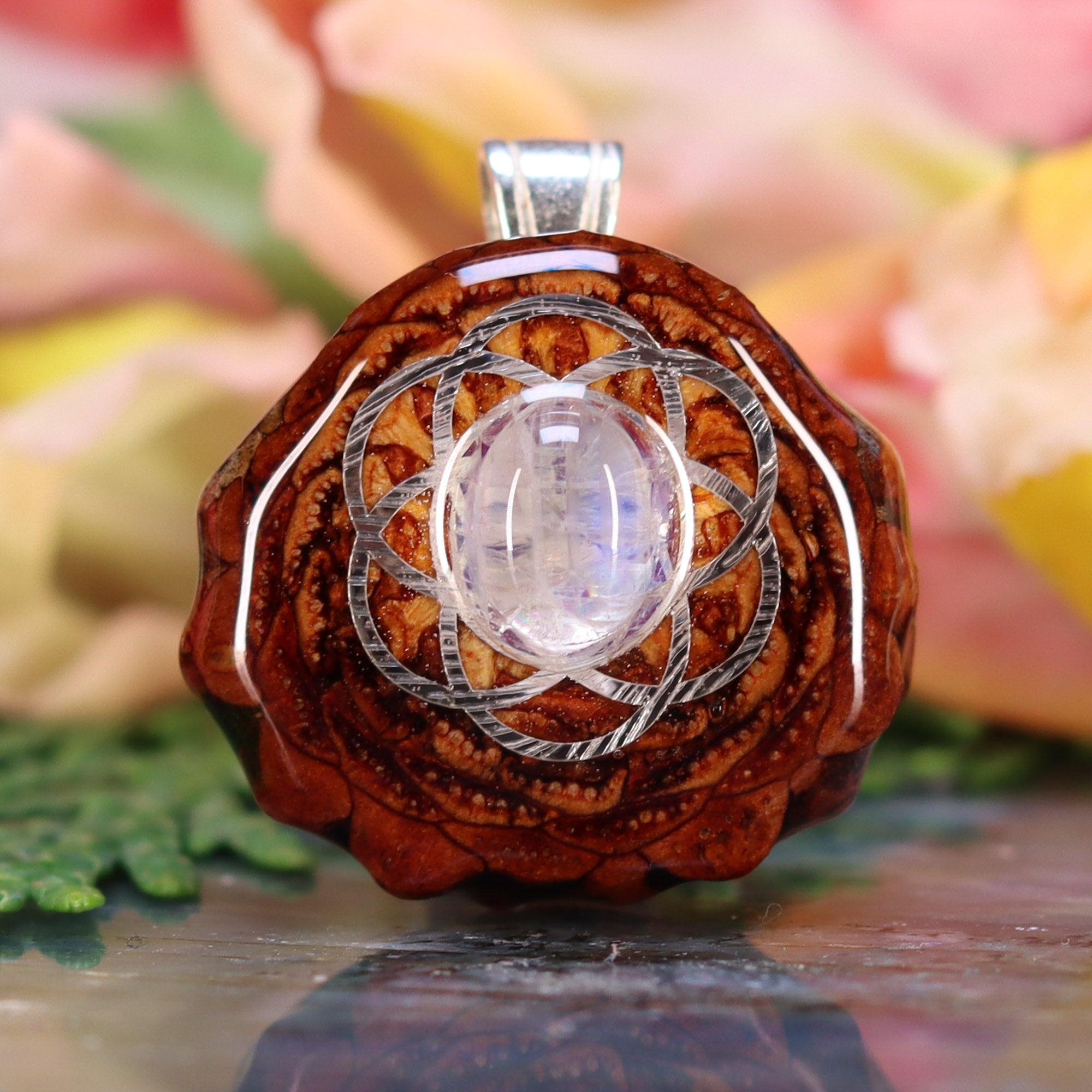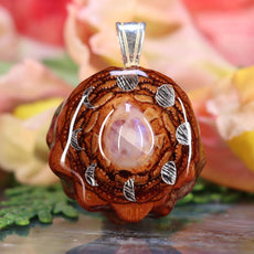 Every pinecone pendant is an elegant gift from Mother Nature -- unveiling the ornate Sacred Geometry hidden at the center of one of the world's densest Pinecones. Because only one cross-section is taken from the "heart" of each Cone, every pendant is absolutely unique, and truly one-of-a-kind.
