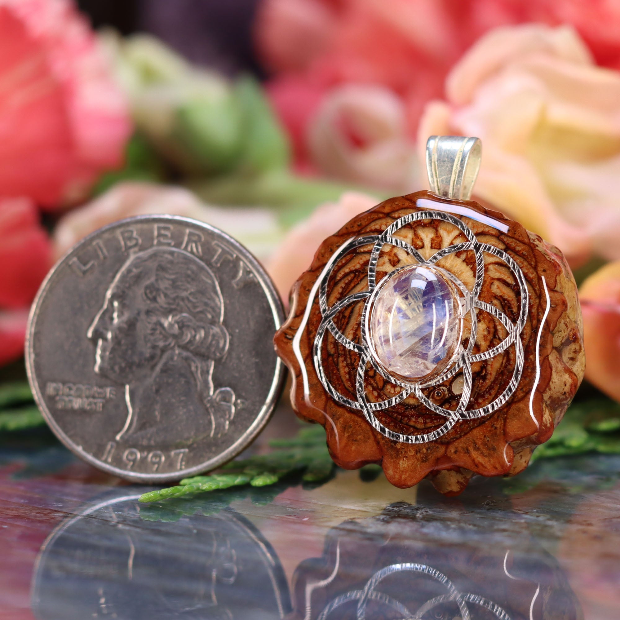 As its name suggests, Moonstone is strongly connected to the archetypal feminine energies of the moon, intuition, and empathy. It helps reconnect with the softness and wisdom of the great mother if one gets caught up in stress, fixation, or aggression. It is recognized as a powerful tool to make conscious the unconscious, and traditionally has been worn as a pendant to encourage the fruition of one's psychic gifts, as well as to facilitate lucid dreaming.
