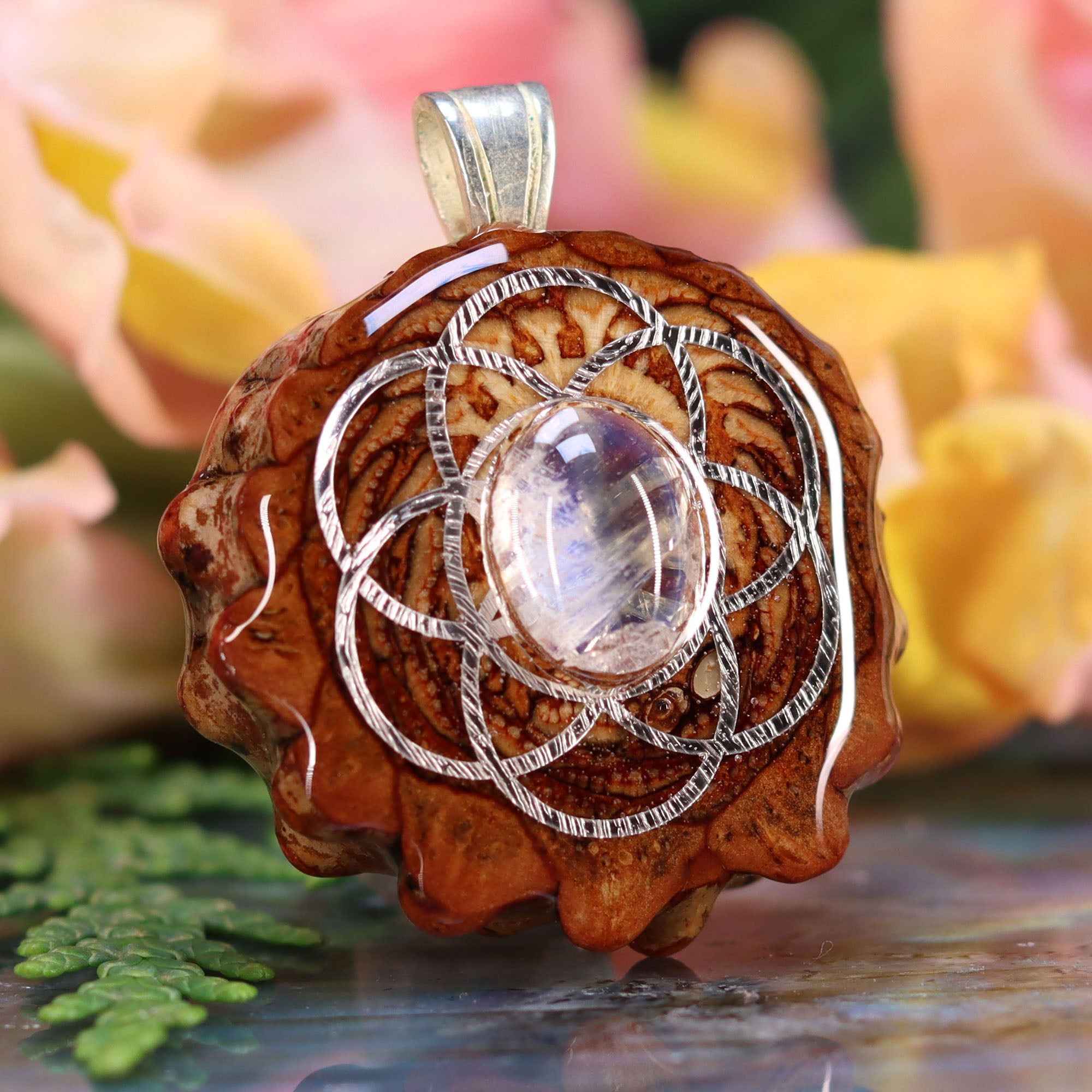 Every pinecone pendant is an elegant gift from Mother Nature -- unveiling the ornate Sacred Geometry hidden at the center of one of the world's densest Pinecones. Because only one cross-section is taken from the "heart" of each Cone, every pendant is absolutely unique, and truly one-of-a-kind.