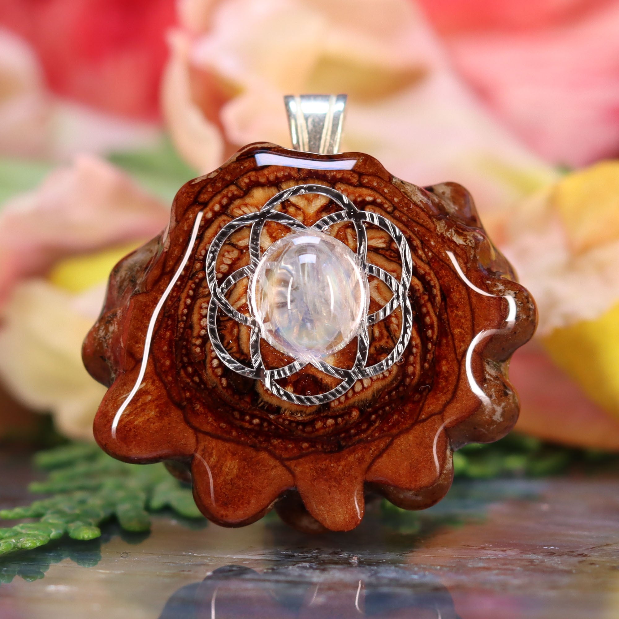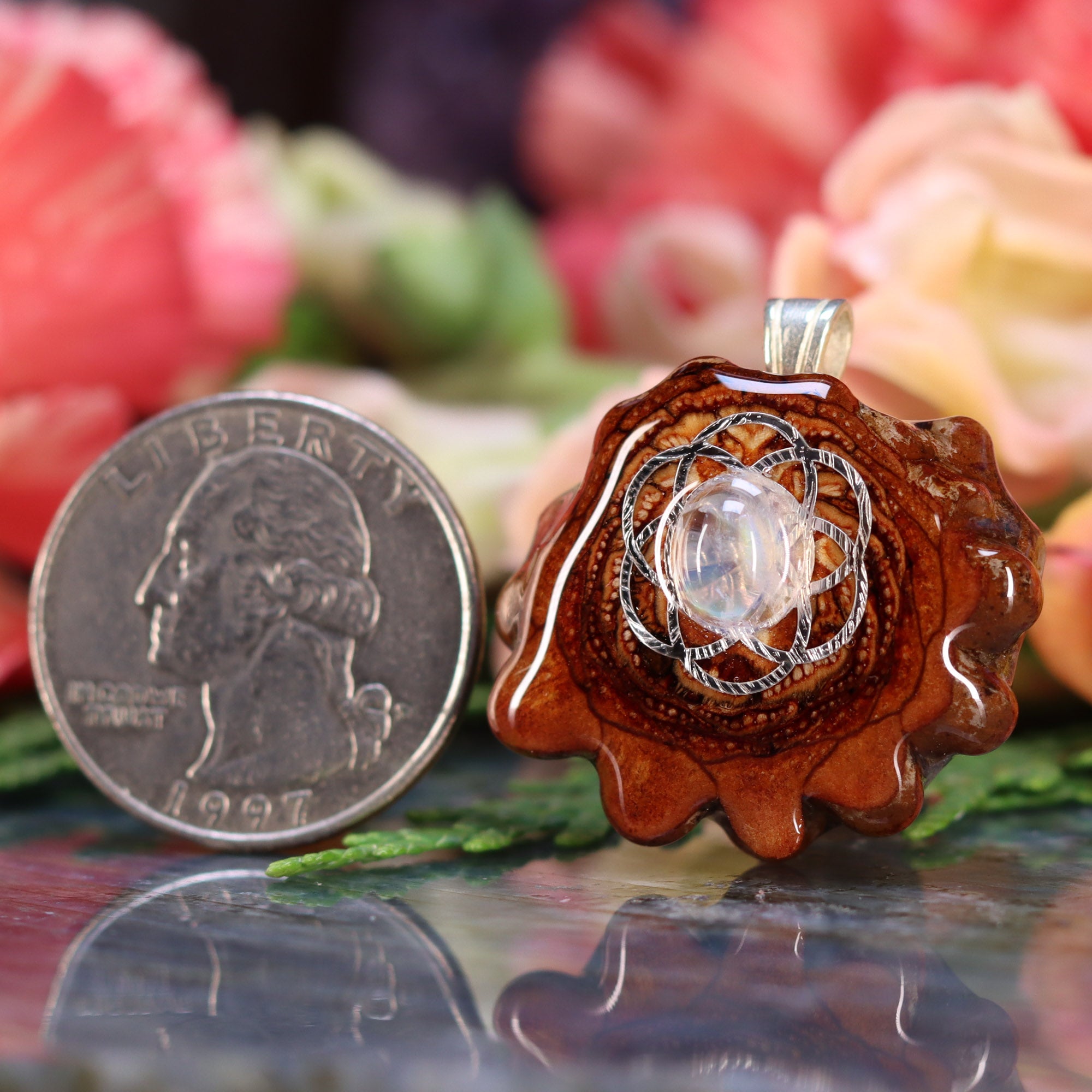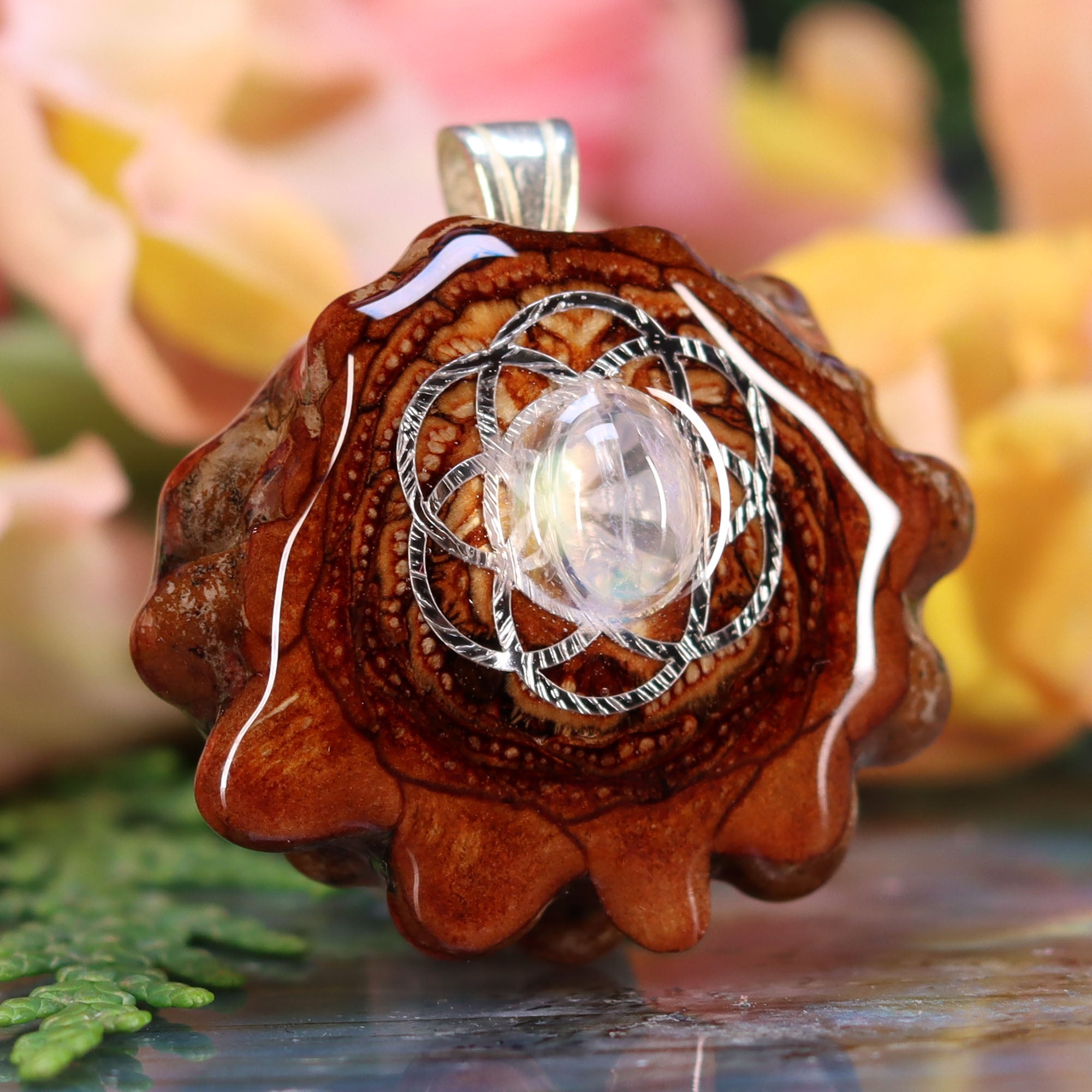 Every pinecone pendant is an elegant gift from Mother Nature -- unveiling the ornate Sacred Geometry hidden at the center of one of the world's densest Pinecones. Because only one cross-section is taken from the "heart" of each Cone, every pendant is absolutely unique, and truly one-of-a-kind.