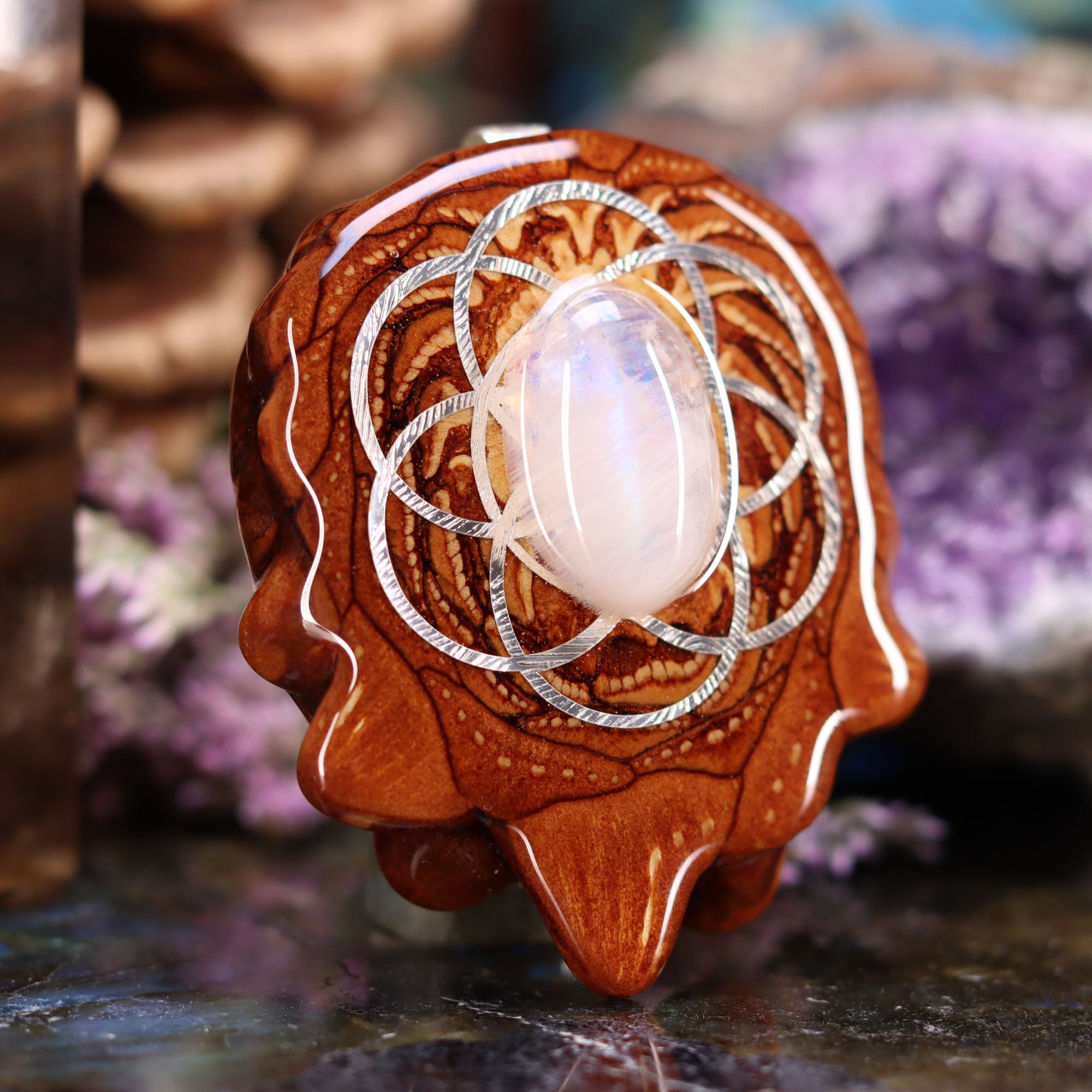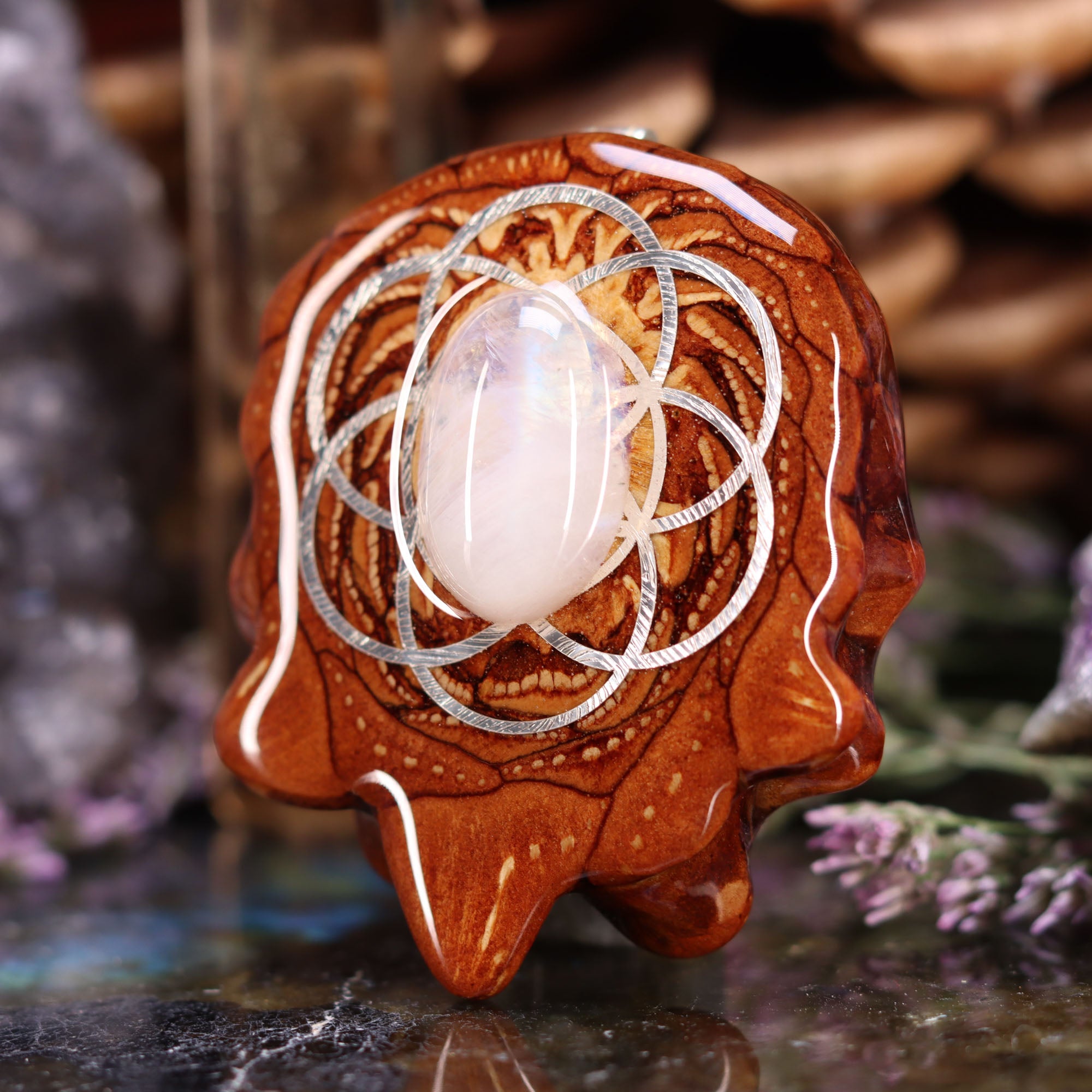 As its name suggests, Moonstone is strongly connected to the archetypal feminine energies of the moon, intuition, and empathy. It helps reconnect with the softness and wisdom of the great mother if one gets caught up in stress, fixation, or aggression. It is recognized as a powerful tool to make conscious the unconscious, and traditionally has been worn as a pendant to encourage the fruition of one's psychic gifts, as well as to facilitate lucid dreaming.