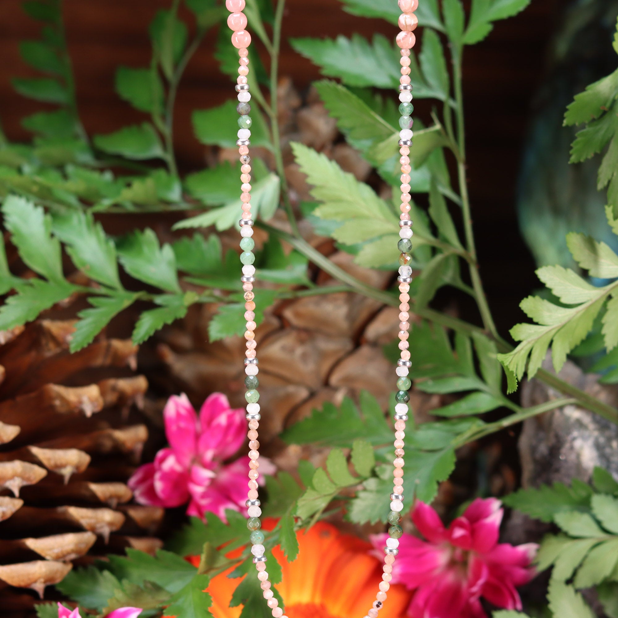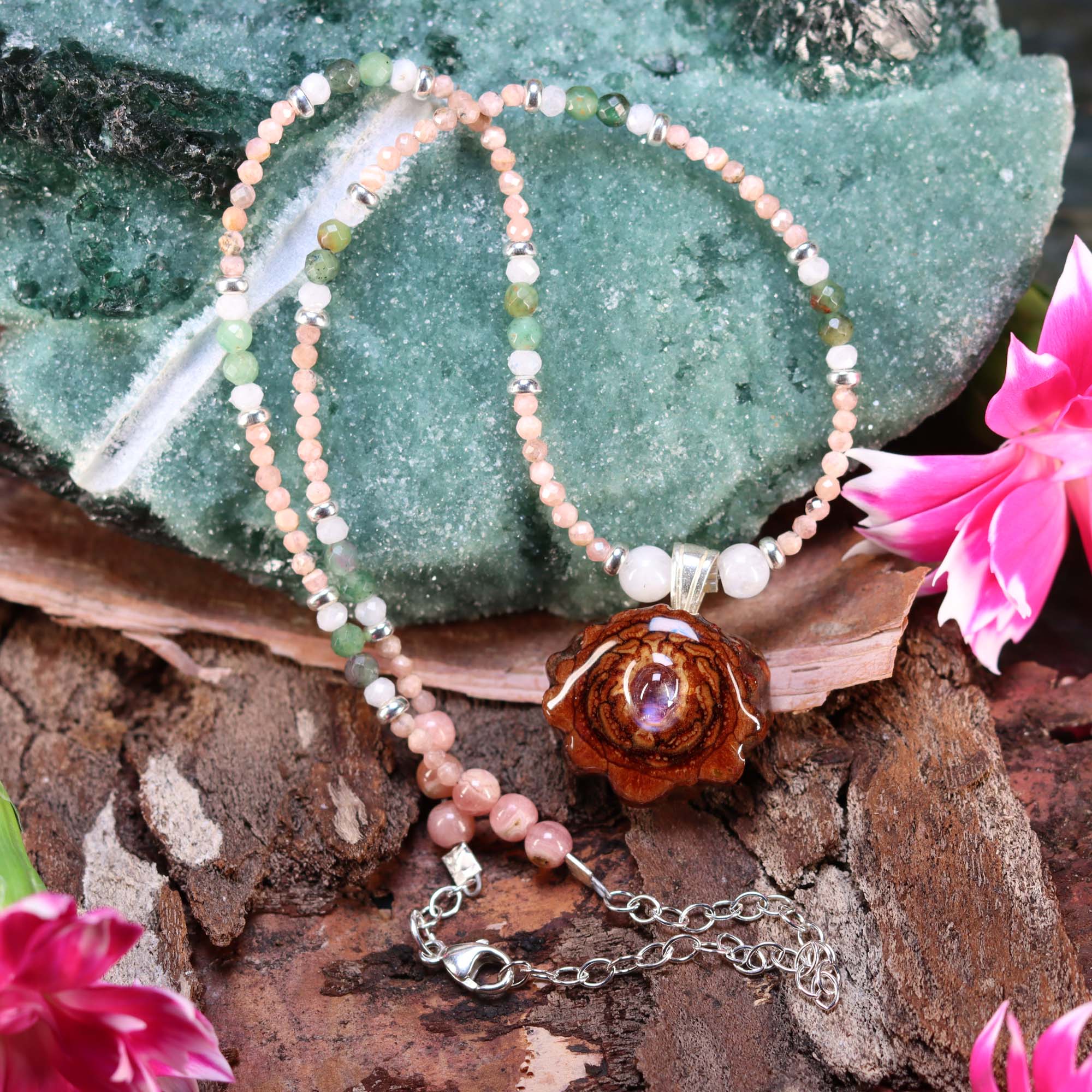 This necklace measures 13-15.75 inches (33-40 cm) and features a Moonstone pendant lovingly strung with a 3.75-inch length-adjustable Sterling Silver chain with Moonstone, Rhodochrosite, and Chrysoprase beads to activate and energize body, mind and spirit!