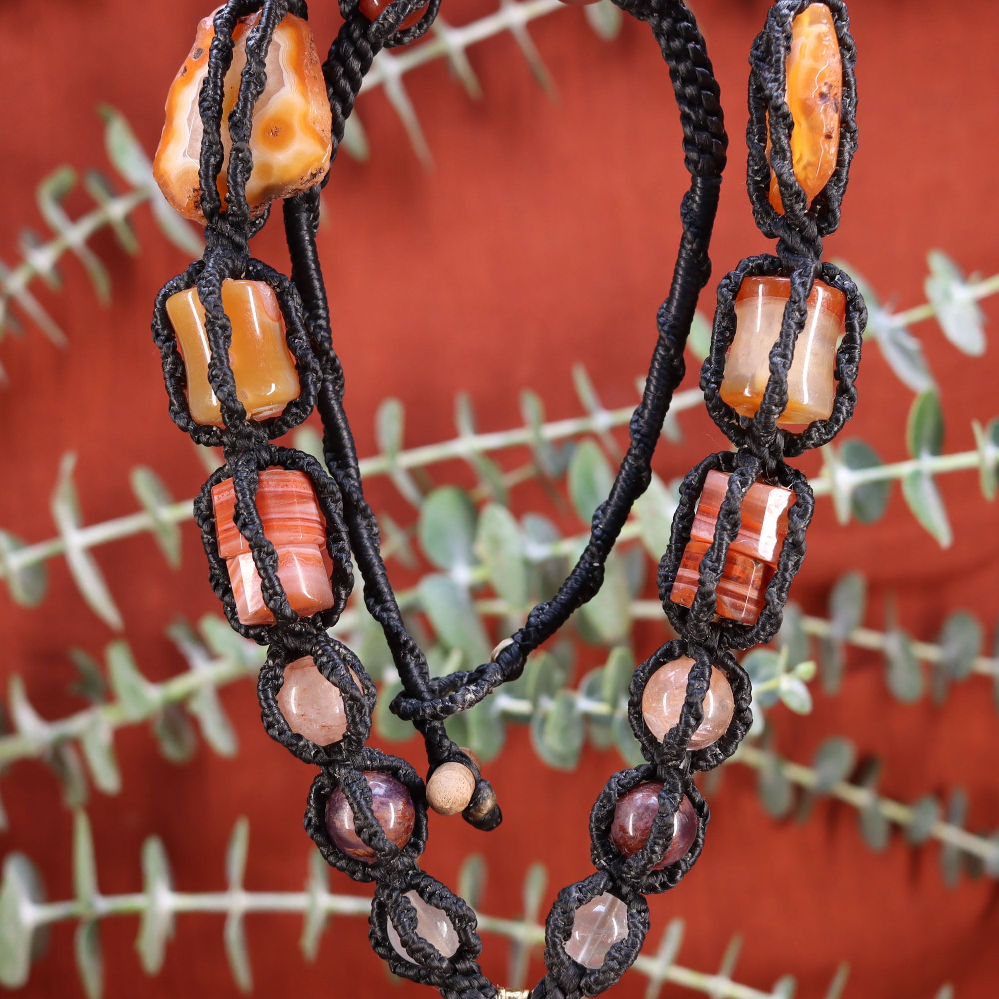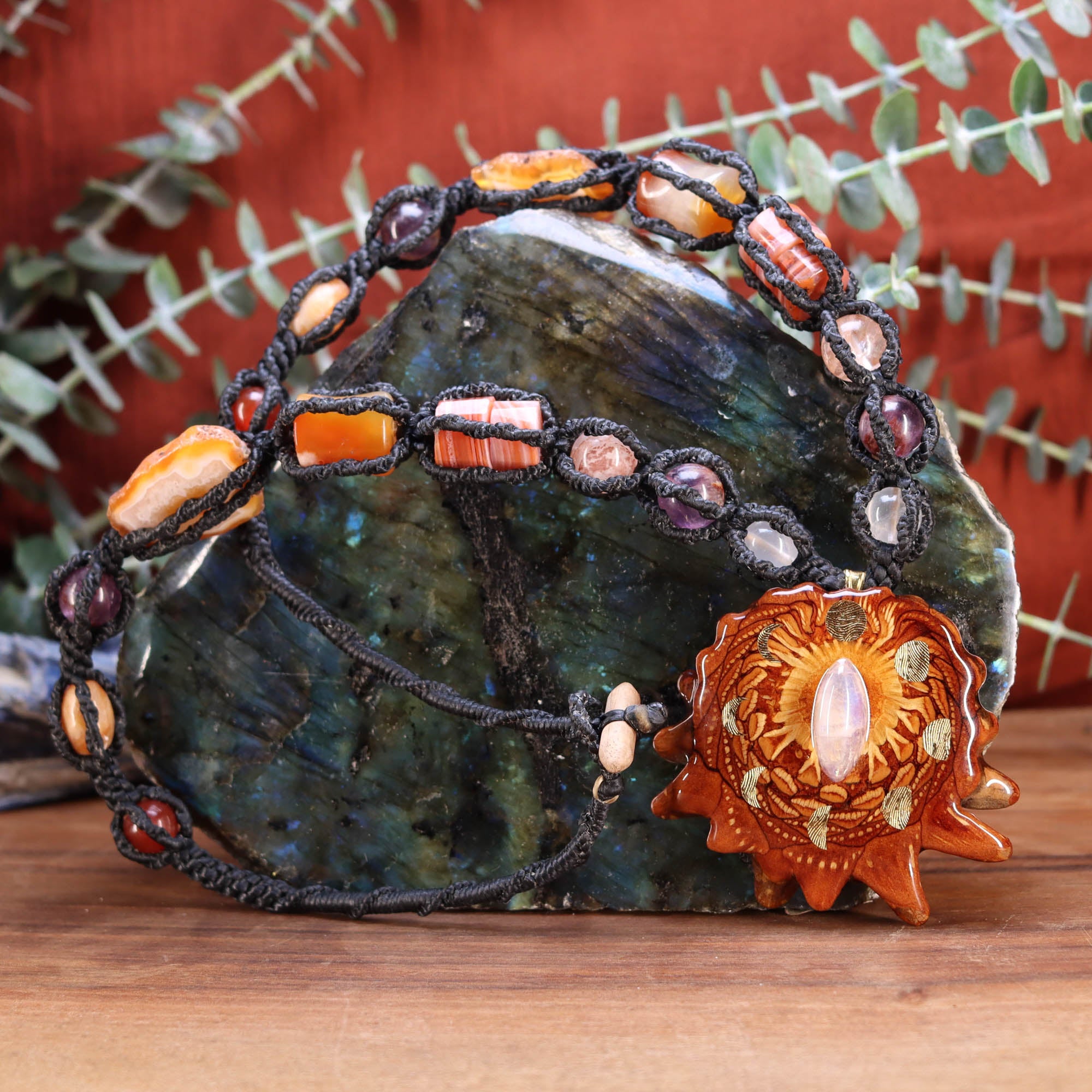 Hand-woven in Bellingham, WA, this necklace features a Moonstone with Gold Moon Cycle pendant lovingly strung with Rose Quartz, Super Seven, Rutilated Quartz, Orange Banded Agate, Carnelian, and Orange Calcite beads to activate and energize body, mind and spirit!