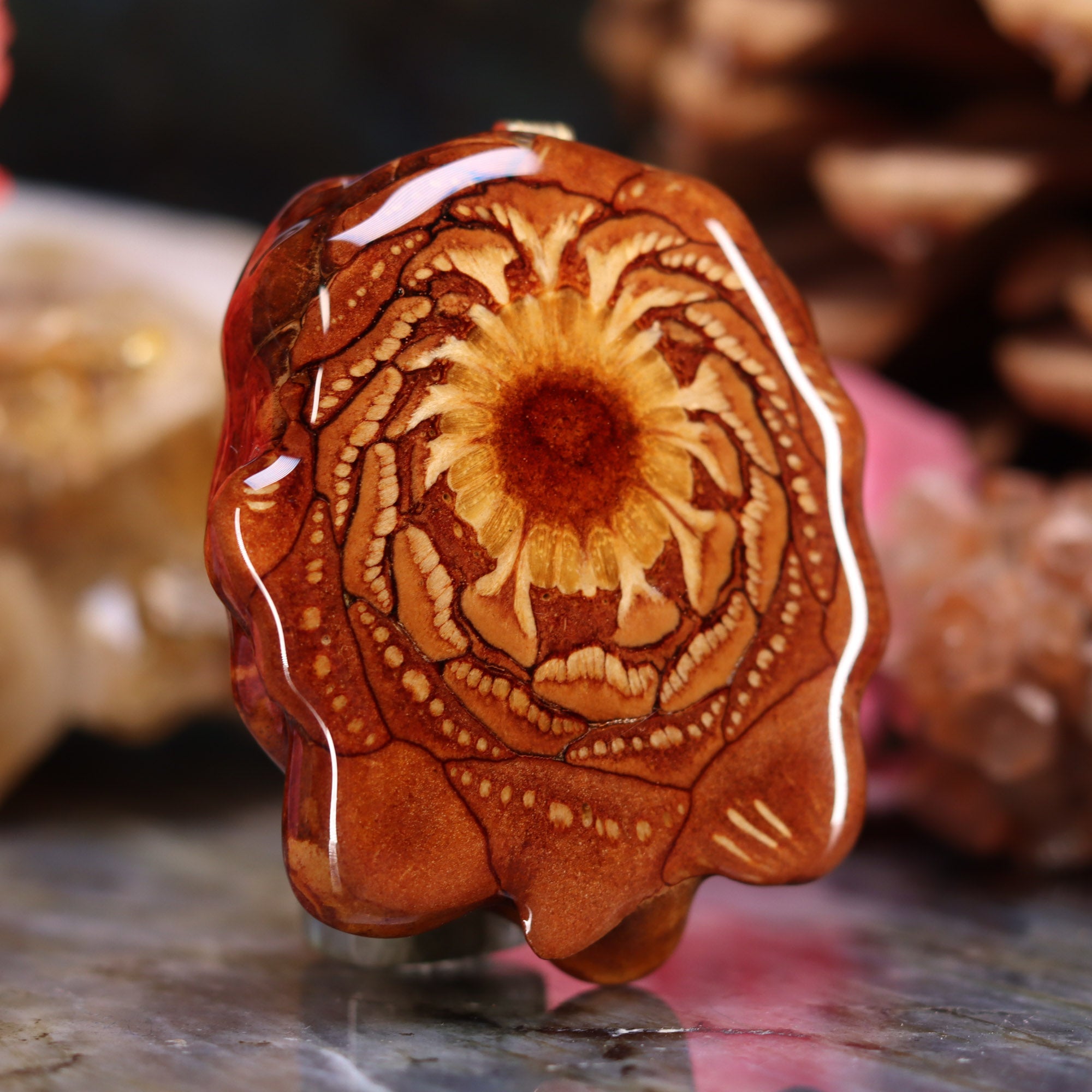 Every pinecone pendant is an elegant gift from Mother Nature -- unveiling the ornate Sacred Geometry hidden at the center of the world's densest Pinecone. Because only one cross-section is taken from the "heart" of each Cone, every pendant is absolutely unique, and truly the one-of-a-kind.