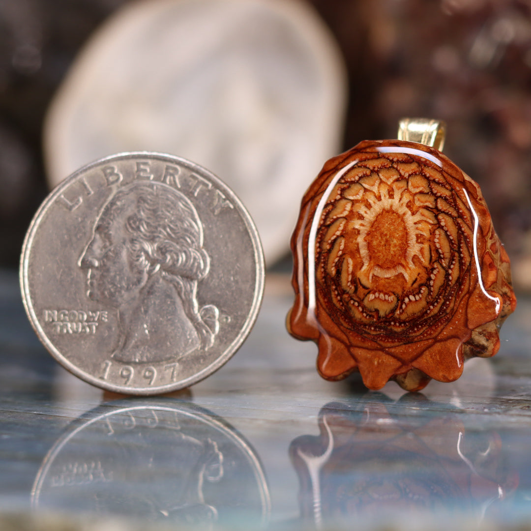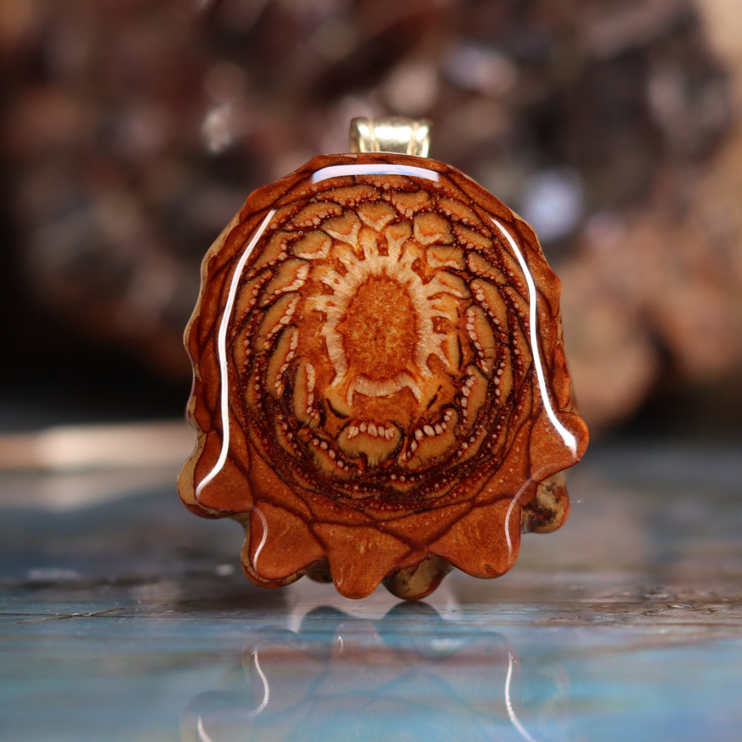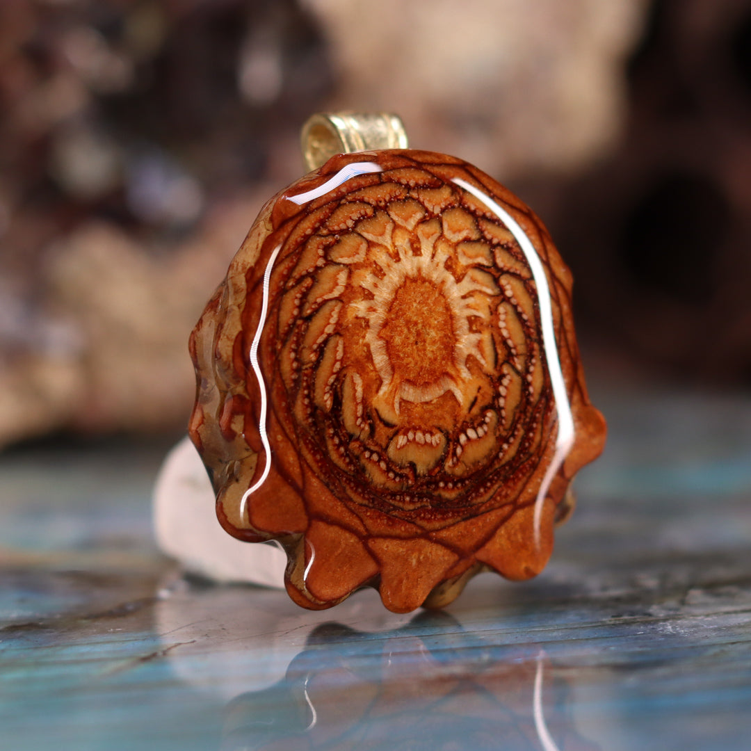 Every pinecone pendant is an elegant gift from Mother Nature -- unveiling the ornate Sacred Geometry hidden at the center of the world's densest Pinecone. Because only one cross-section is taken from the "heart" of each Cone, every pendant is absolutely unique, and truly the one-of-a-kind.