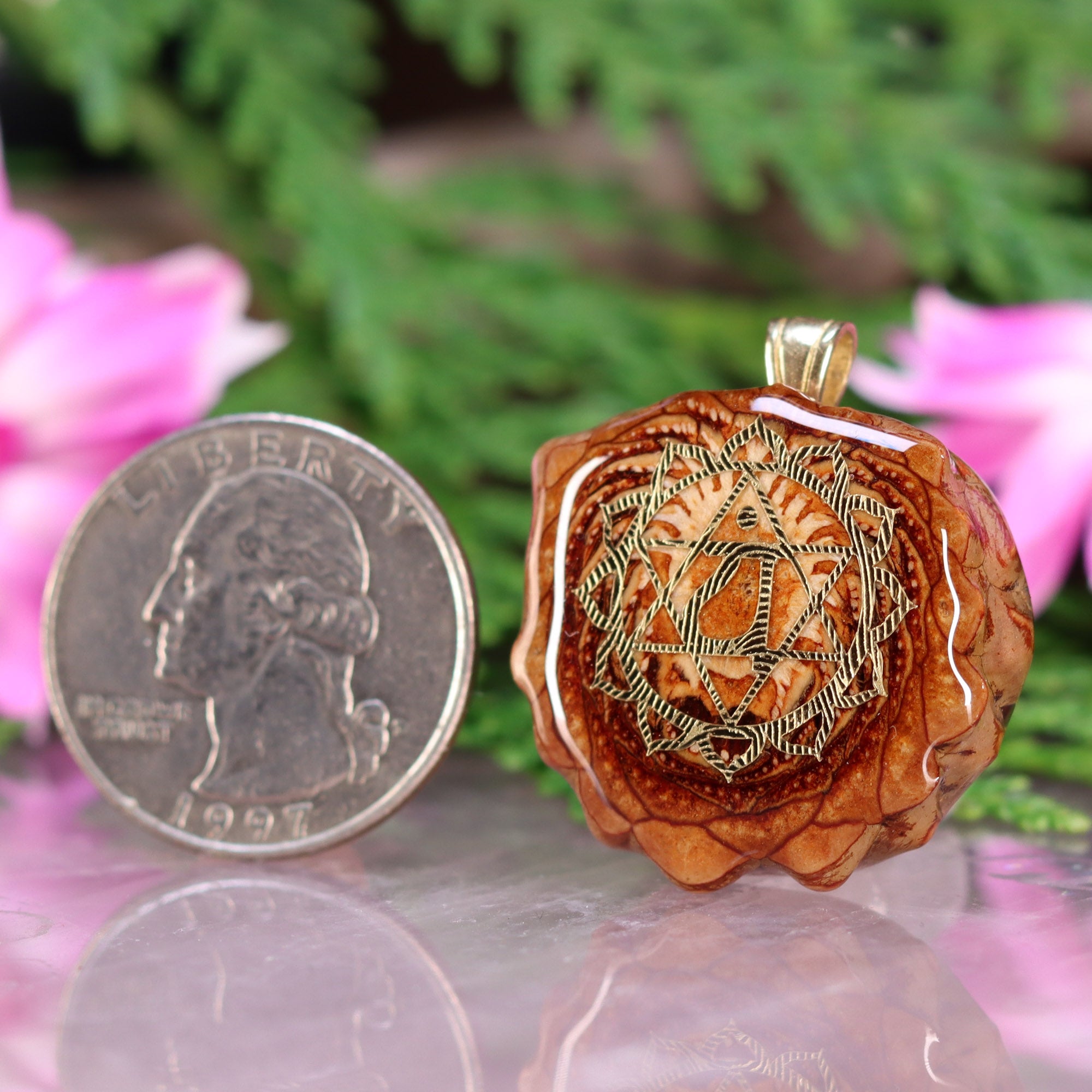 Every pinecone pendant is an elegant gift from Mother Nature -- unveiling the ornate Sacred Geometry hidden at the center of one of the world's densest Pinecones. Because only one cross-section is taken from the "heart" of each Cone, every pendant is absolutely unique, and truly one-of-a-kind.