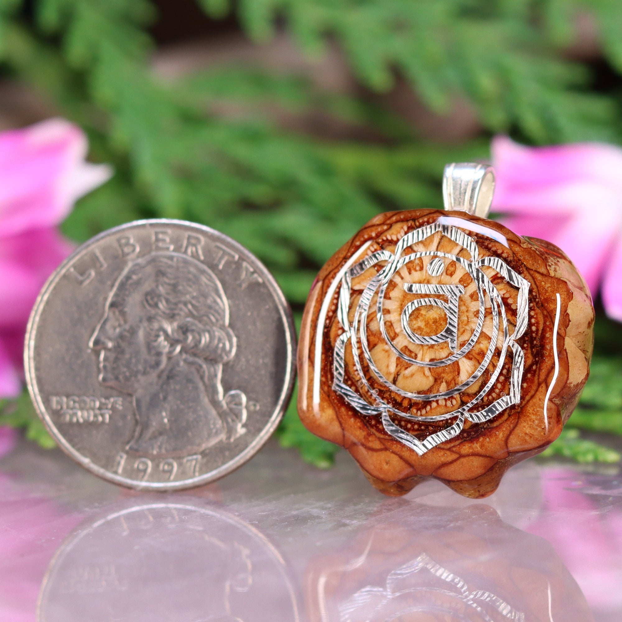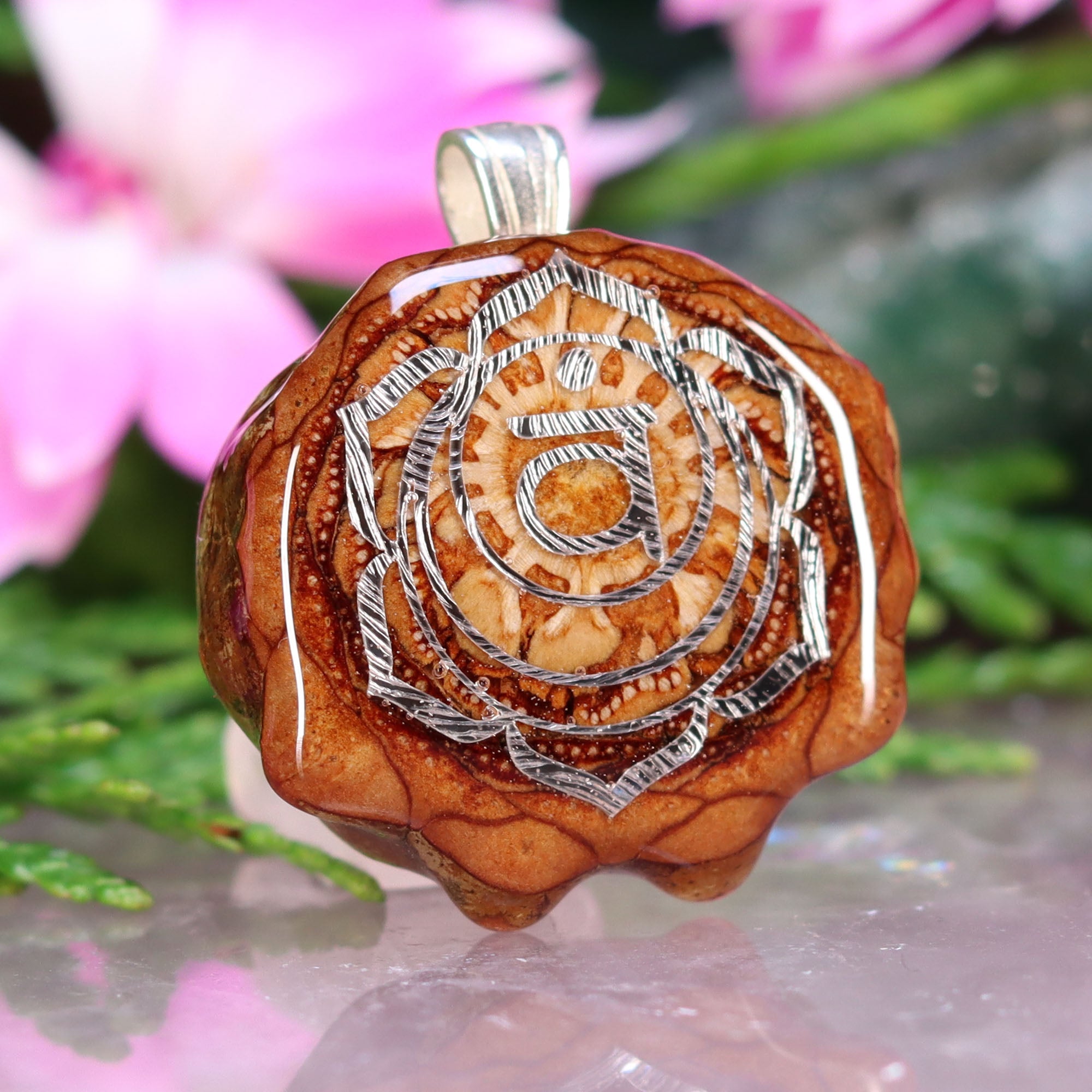 This Pinecone is blessed by a Sterling Silver emblem of the 2nd chakra, the Sacral Chakra. Known as “Svadisthana” (meaning "dwelling in the self") in Sanskrit, the 2nd chakra relates to personal empowerment, sexuality, creativity, and personal freedom.