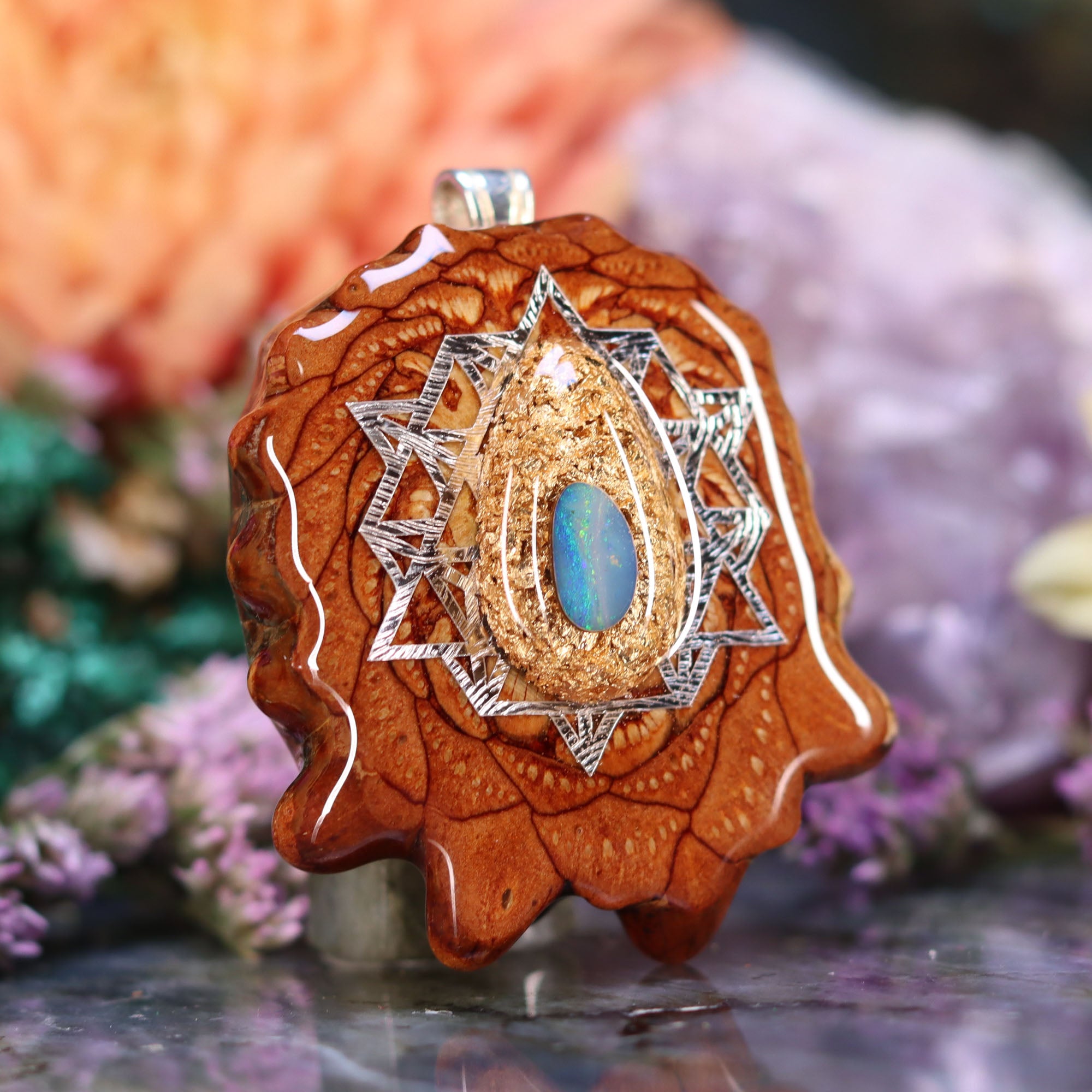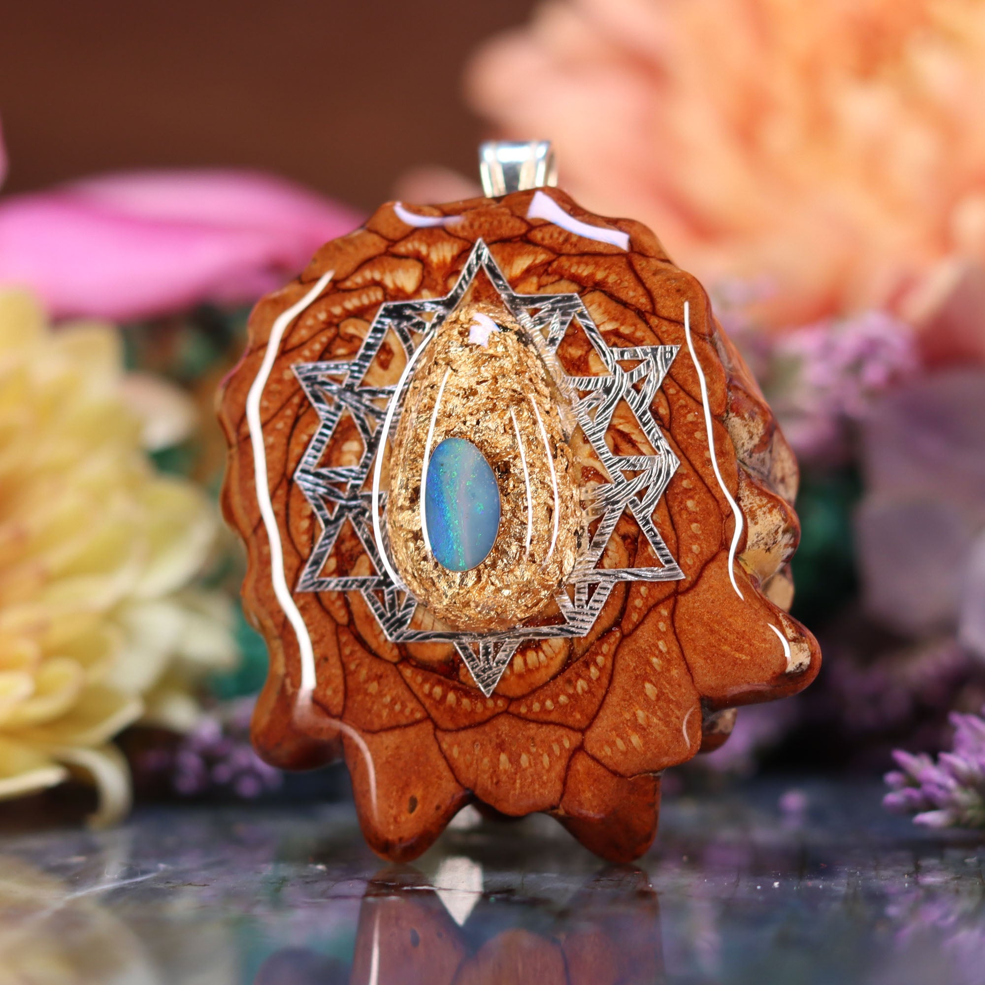 This pendant has been paired with a miniature “Orgone Generator” set with Australian Blue Opal to awaken body, mind, and spirit! A magic mix of metal shavings, resin, crystal fragments, and a quartz crystal specially crafted by Third Eye Pinecones help form this uniquely powerful spiritual device. Its benefits are said to be many, primarily because it is believed to draw in harmful ambient EMFs and bio-energy and transmute them within its internal crystalline matrix – which it then re-emits as positive biomagnetic energy.