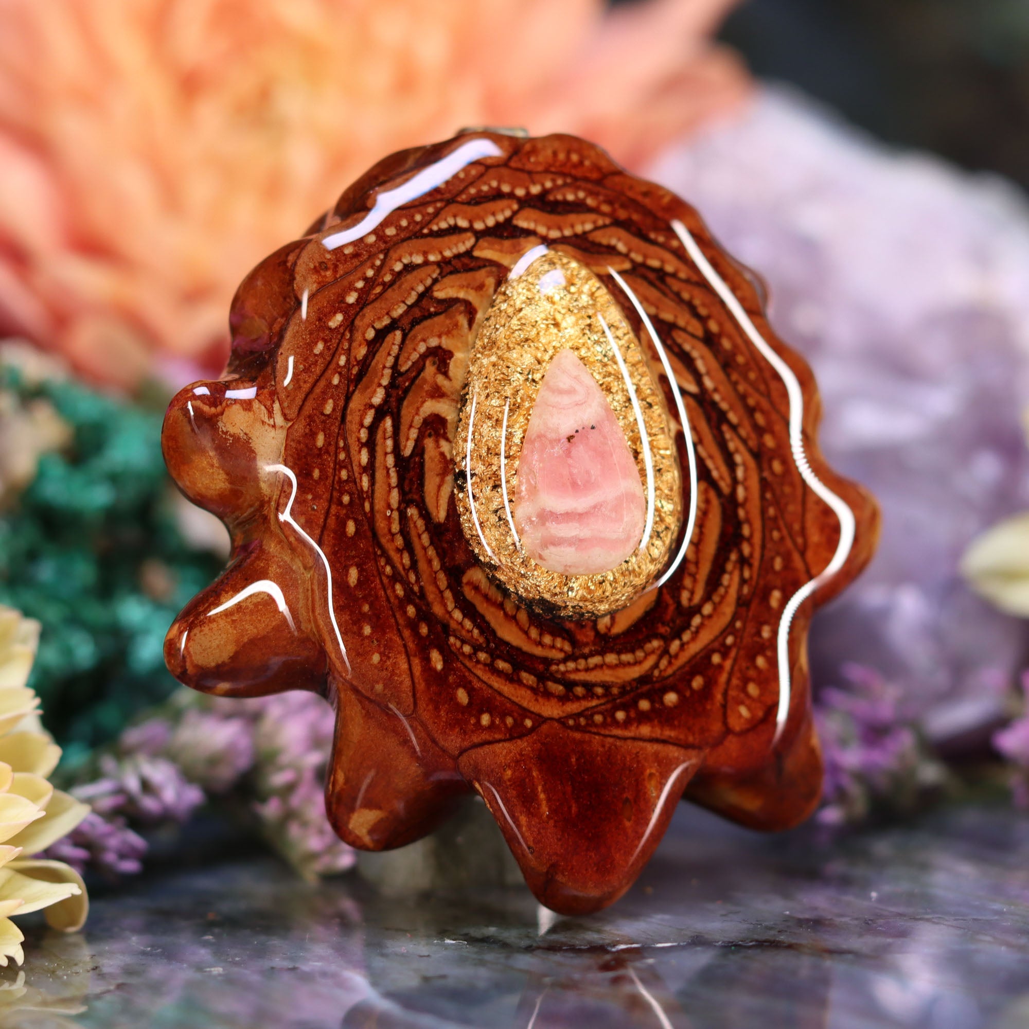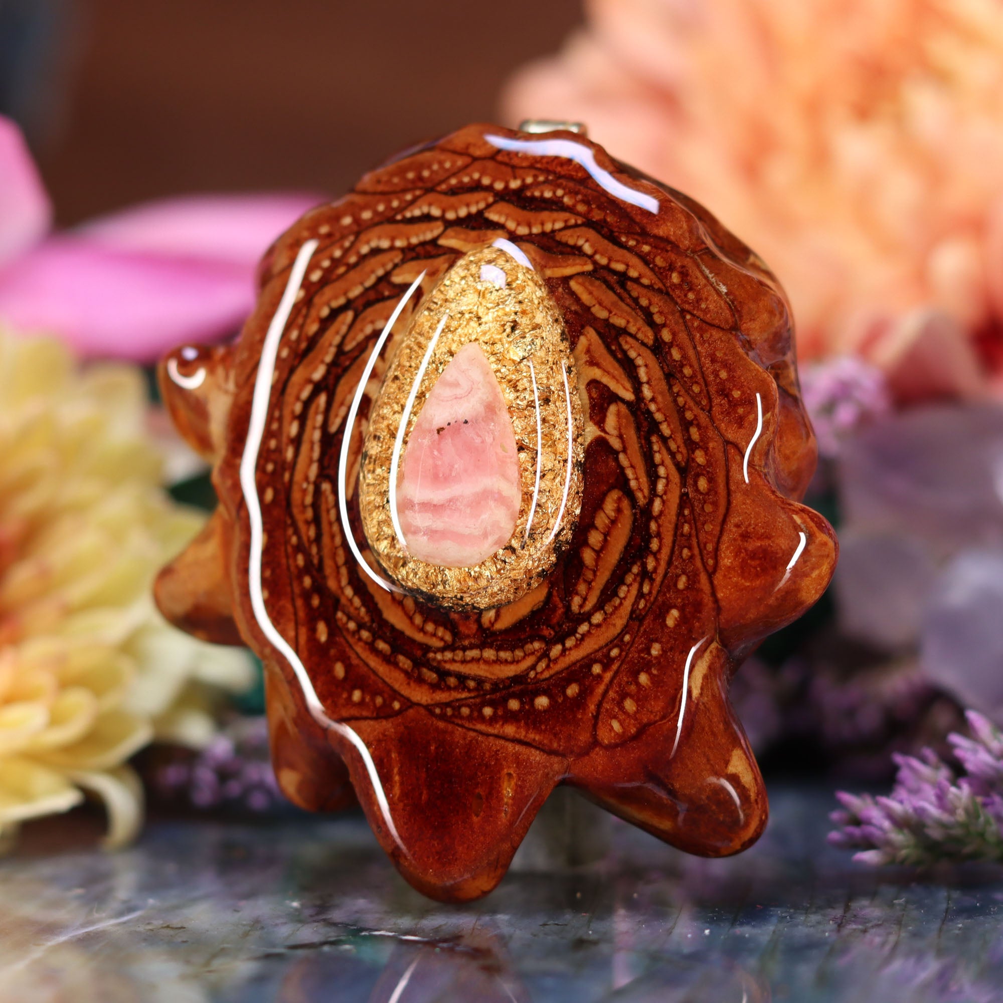 This pendant has been paired with a miniature “Orgone Generator” set with Rhodochrosite to awaken body, mind, and spirit! A magic mix of metal shavings, resin, crystal fragments, and a quartz crystal specially crafted by Third Eye Pinecones help form this uniquely powerful spiritual device. Its benefits are said to be many, primarily because it is believed to draw in harmful ambient EMFs and bio-energy and transmute them within its internal crystalline matrix – which it then re-emits as positive biomagnetic energy.