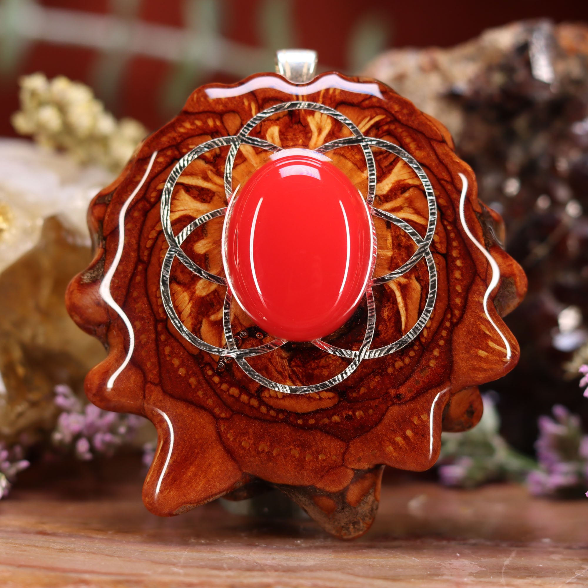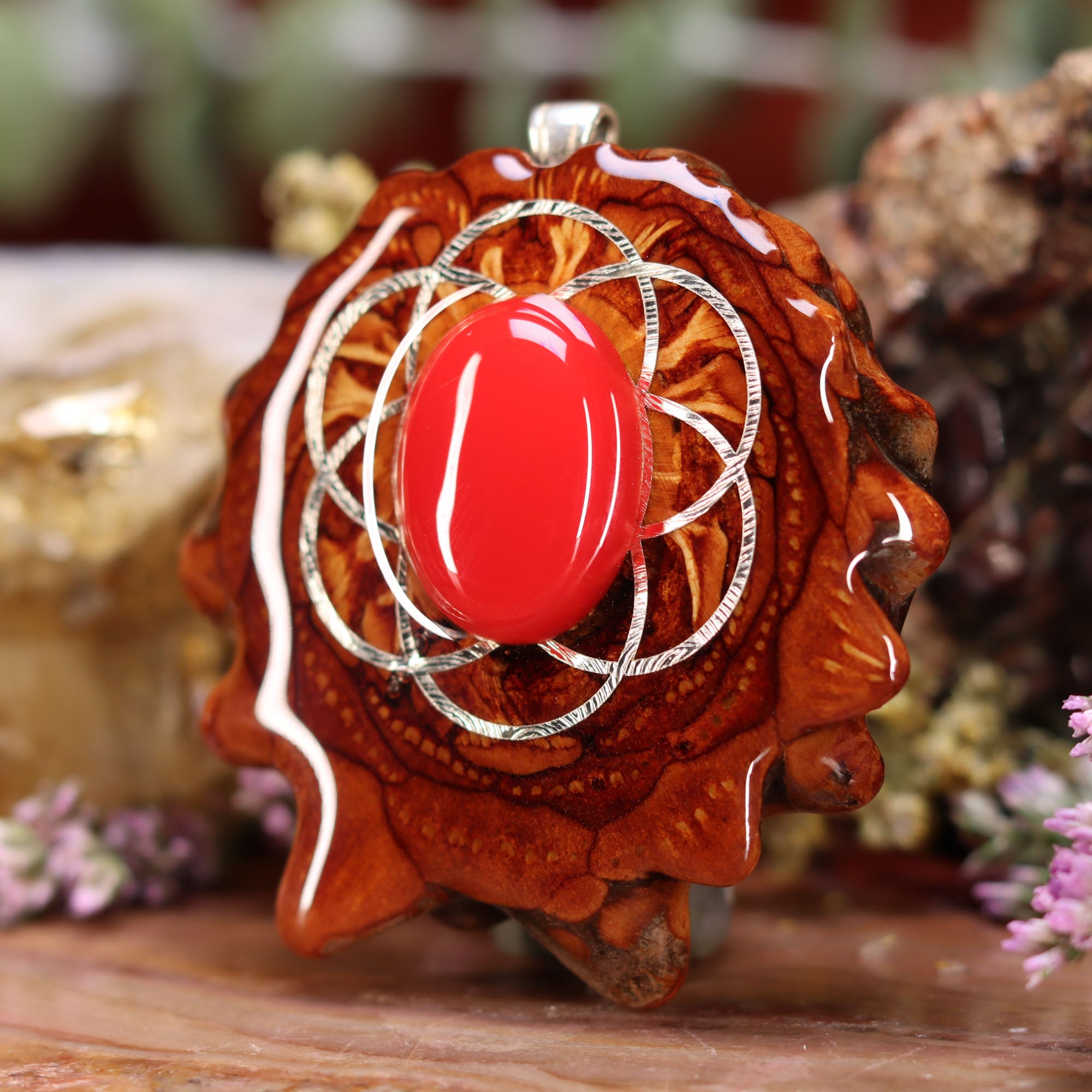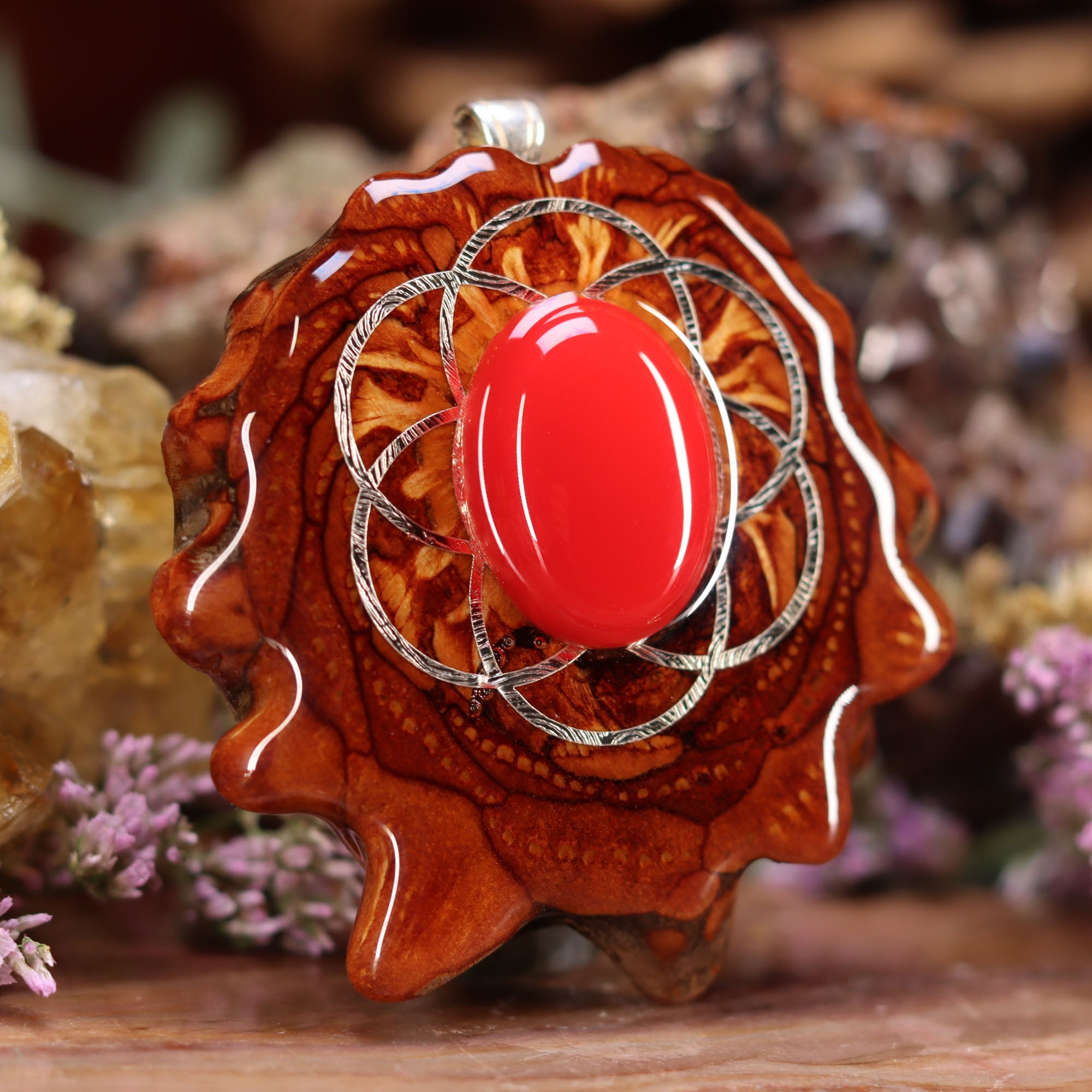 Every pinecone pendant is an elegant gift from Mother Nature -- unveiling the ornate Sacred Geometry hidden at the center of one of the world's densest Pinecones. Because only one cross-section is taken from the "heart" of each Cone, every pendant is absolutely unique, and truly one-of-a-kind.