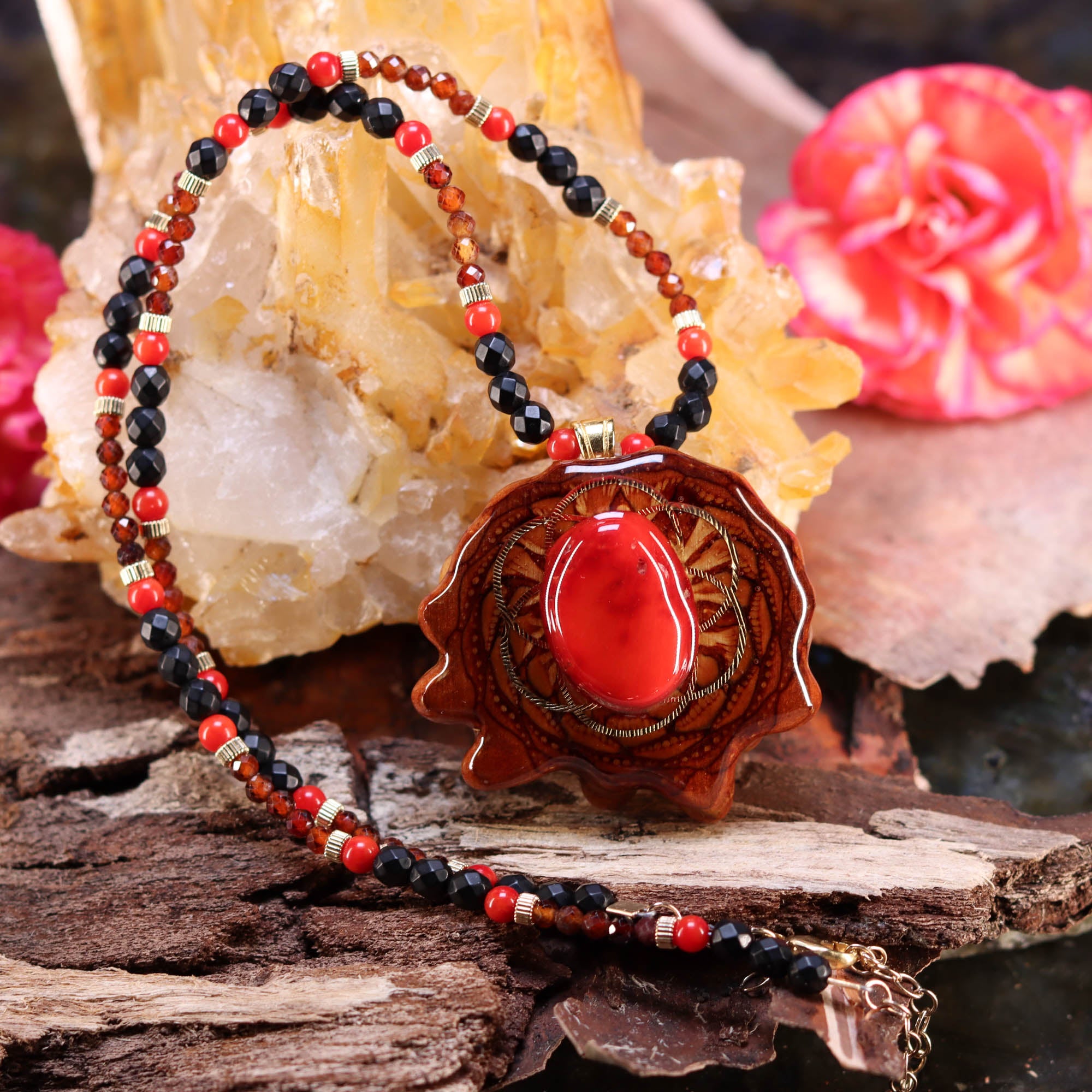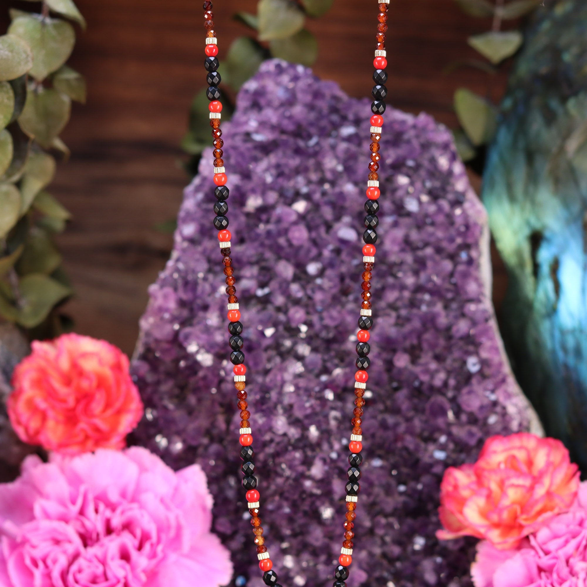 This necklace measures 15 inches (38 cm) and features a Red Coral with Gold Seed of Life pendant lovingly strung with a 3-inch length-adjustable 14k Gold Fill chain with Red Coral, Matte Onyx, and Red Garnet beads to activate and energize body, mind and spirit!