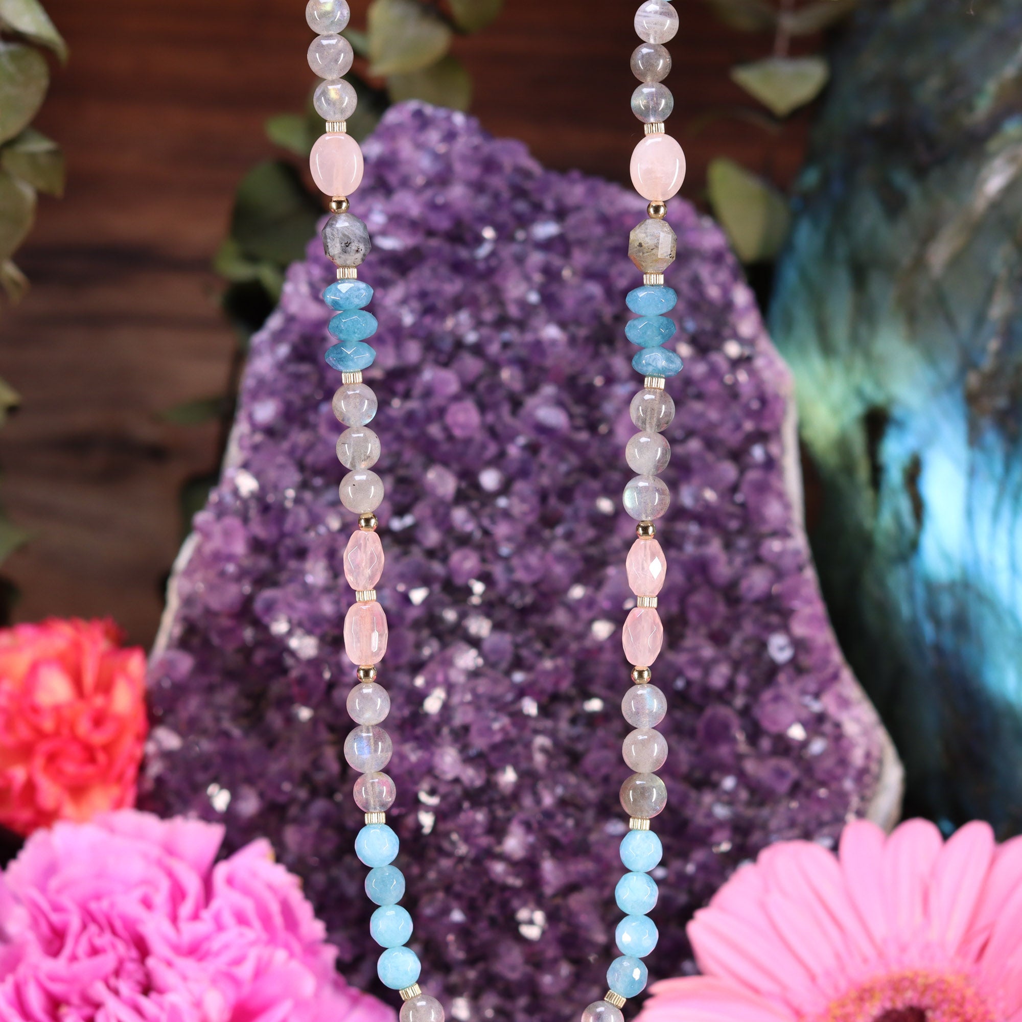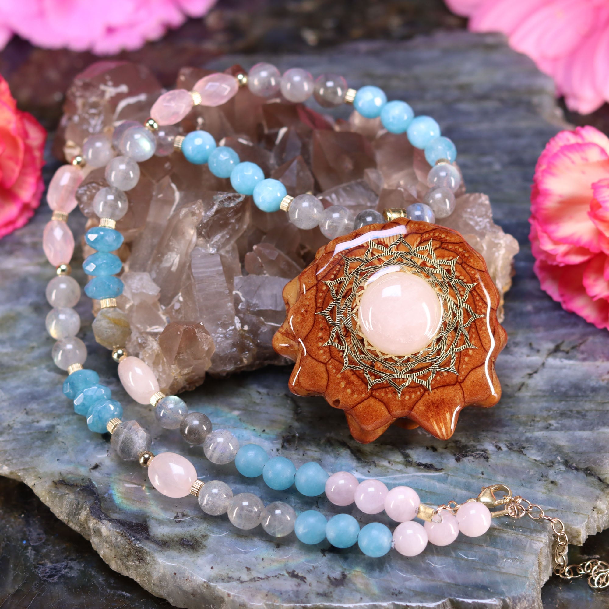 This necklace measures 17.5-21 inches (45-53 cm) and features a Rose Quartz with Gold Crown (7th) Chakra pendant lovingly strung with a 3.25-inch length-adjustable 14k Gold Fill chain strung with Labradorite, Rose Quartz, Amazonite, Aquamarine, and Hemimorphite beads to activate and energize body, mind and spirit!