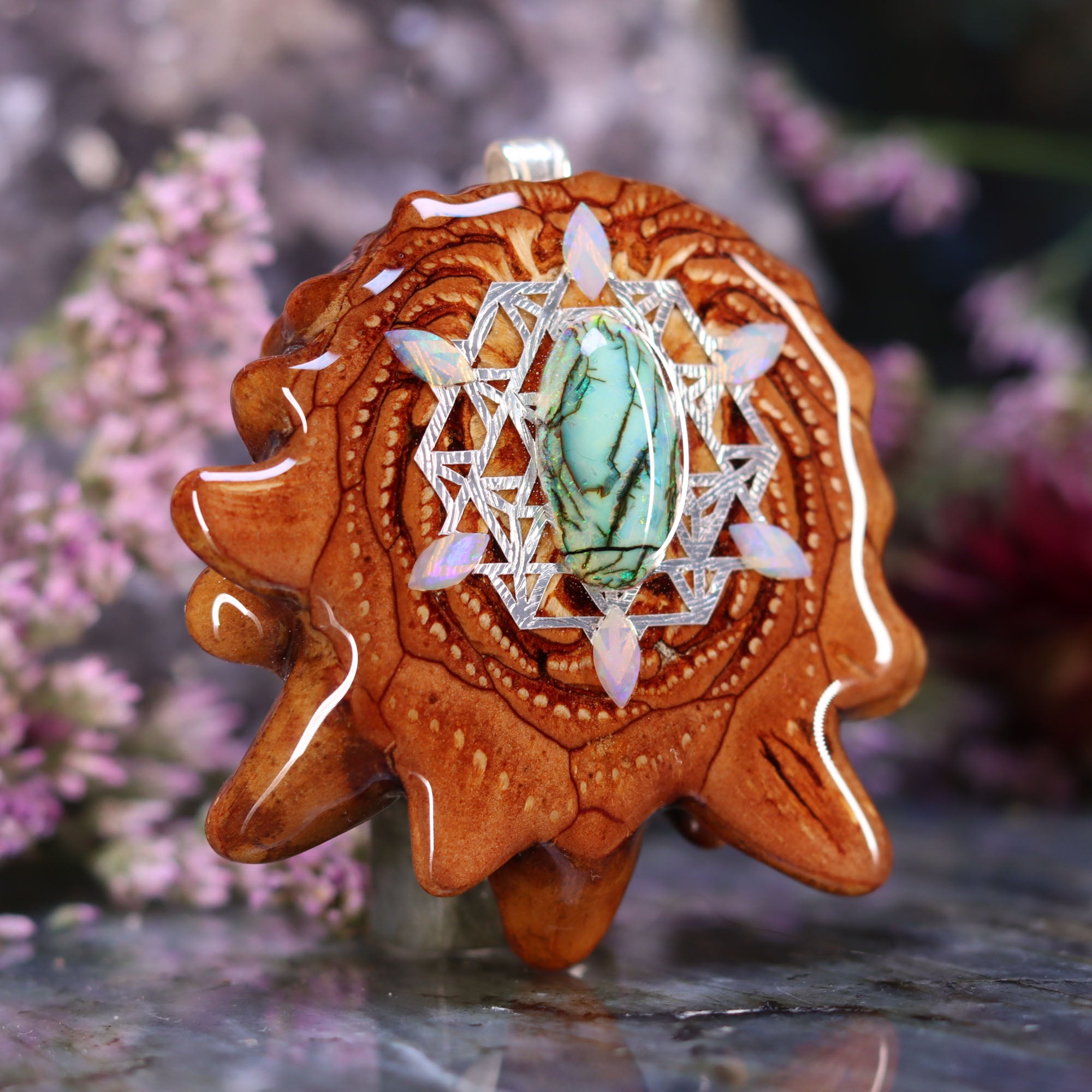 Every pinecone pendant is an elegant gift from Mother Nature -- unveiling the ornate Sacred Geometry hidden at the center of one of the world's densest Pinecones. Because only one cross-section is taken from the "heart" of each Cone, every pendant is absolutely unique, and truly one-of-a-kind.