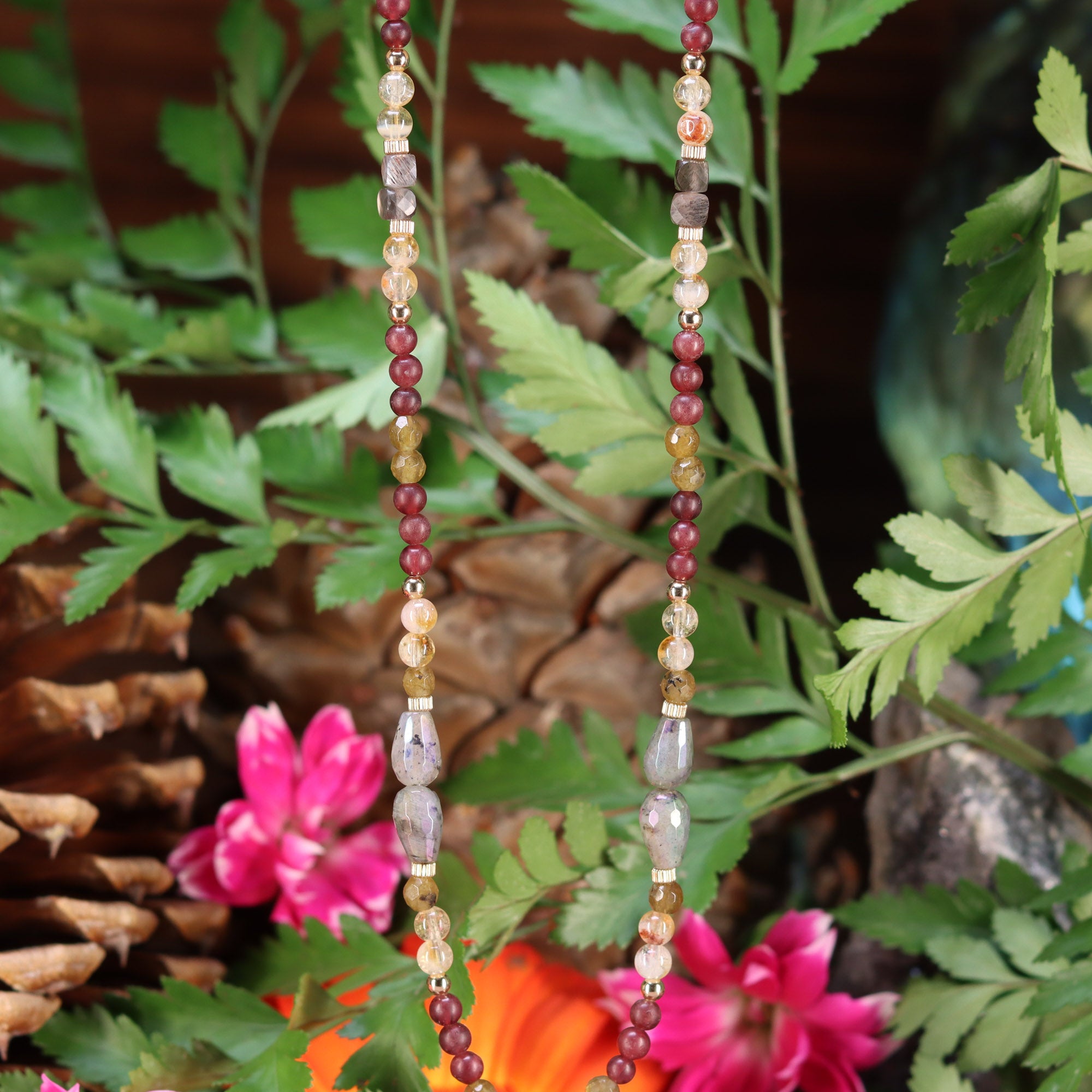 This necklace measures 13.75-18.5 inches (35-46 cm) and features a Tanzanite with Gold Merkaba pendant lovingly strung with a 4.25-inch length-adjustable 14k Gold Fill chain with Labradorite, Matte Ruby, Citrine, Aura Quartz, and Grey Moonstone beads to activate and energize body, mind and spirit!