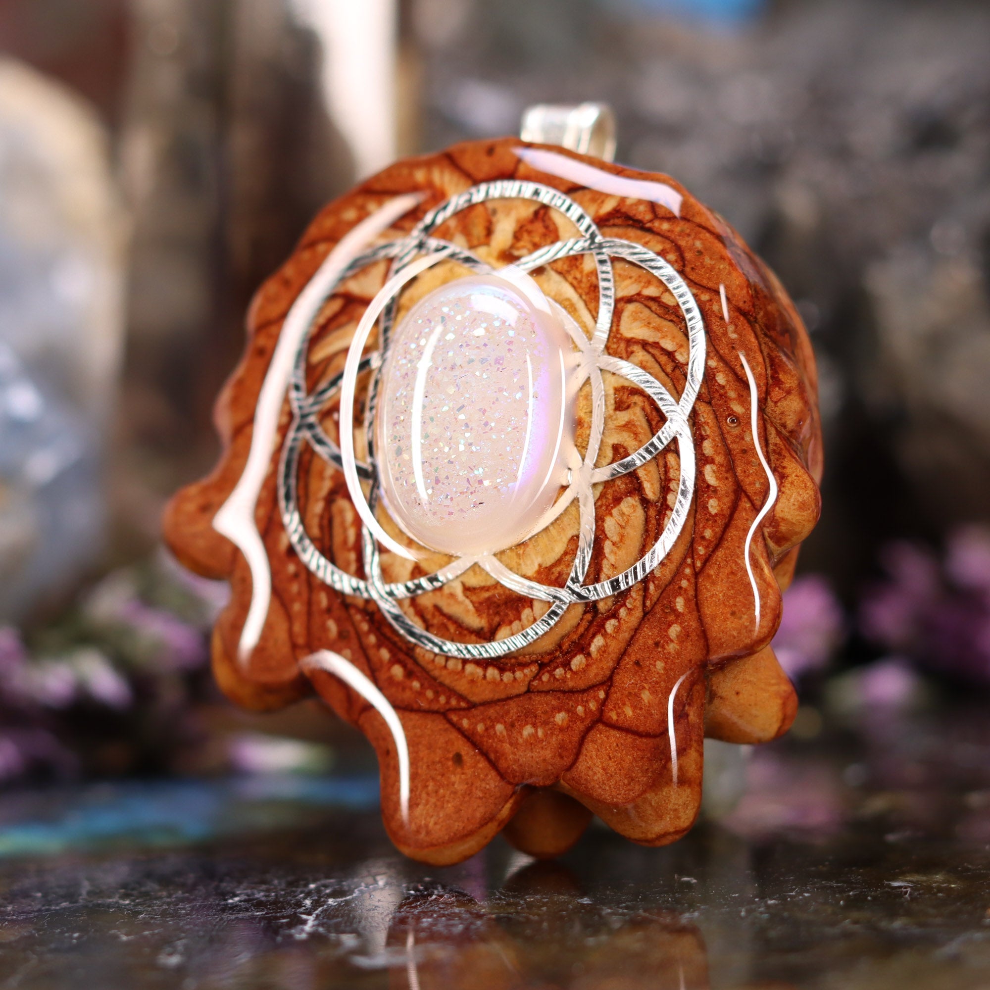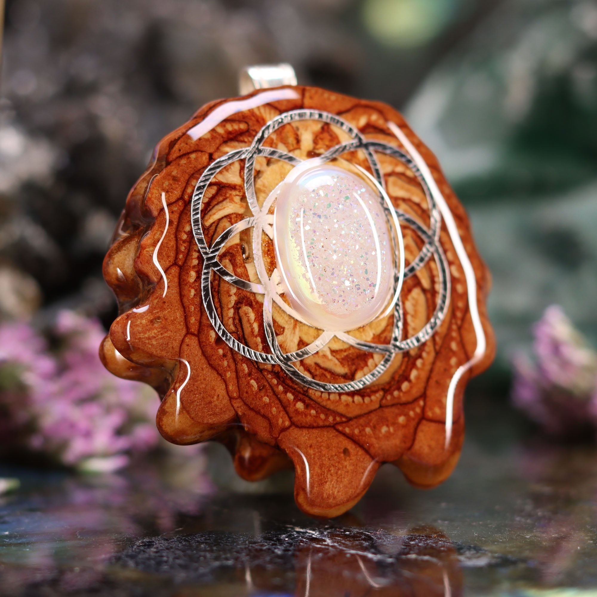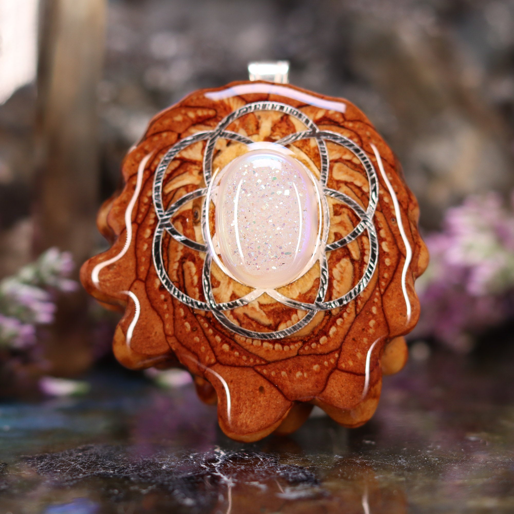 Every pinecone pendant is an elegant gift from Mother Nature -- unveiling the ornate Sacred Geometry hidden at the center of one of the world's densest Pinecones. Because only one cross-section is taken from the "heart" of each Cone, every pendant is absolutely unique, and truly one-of-a-kind.