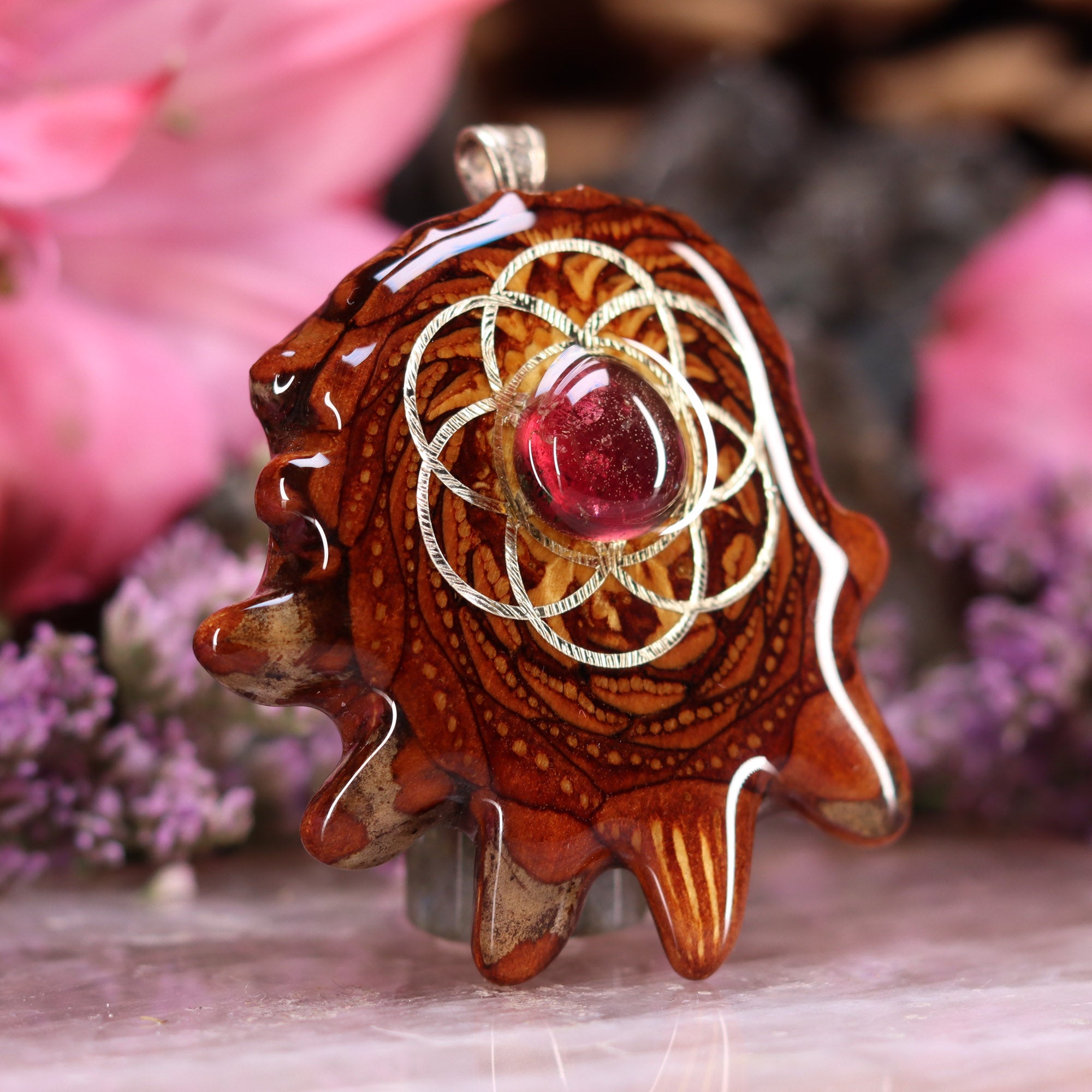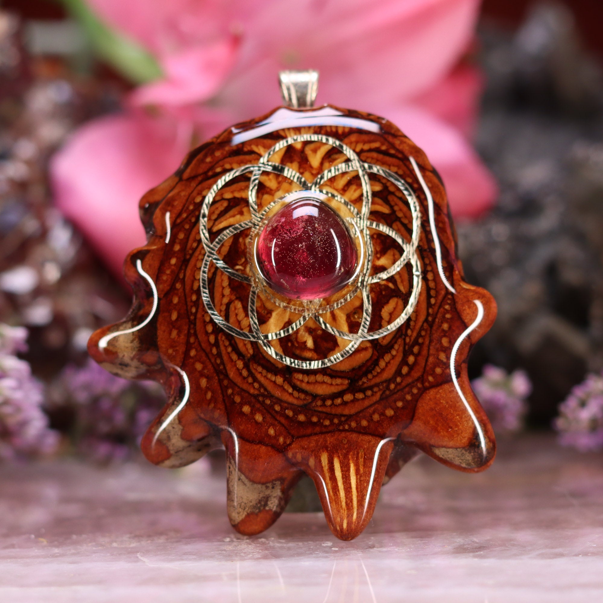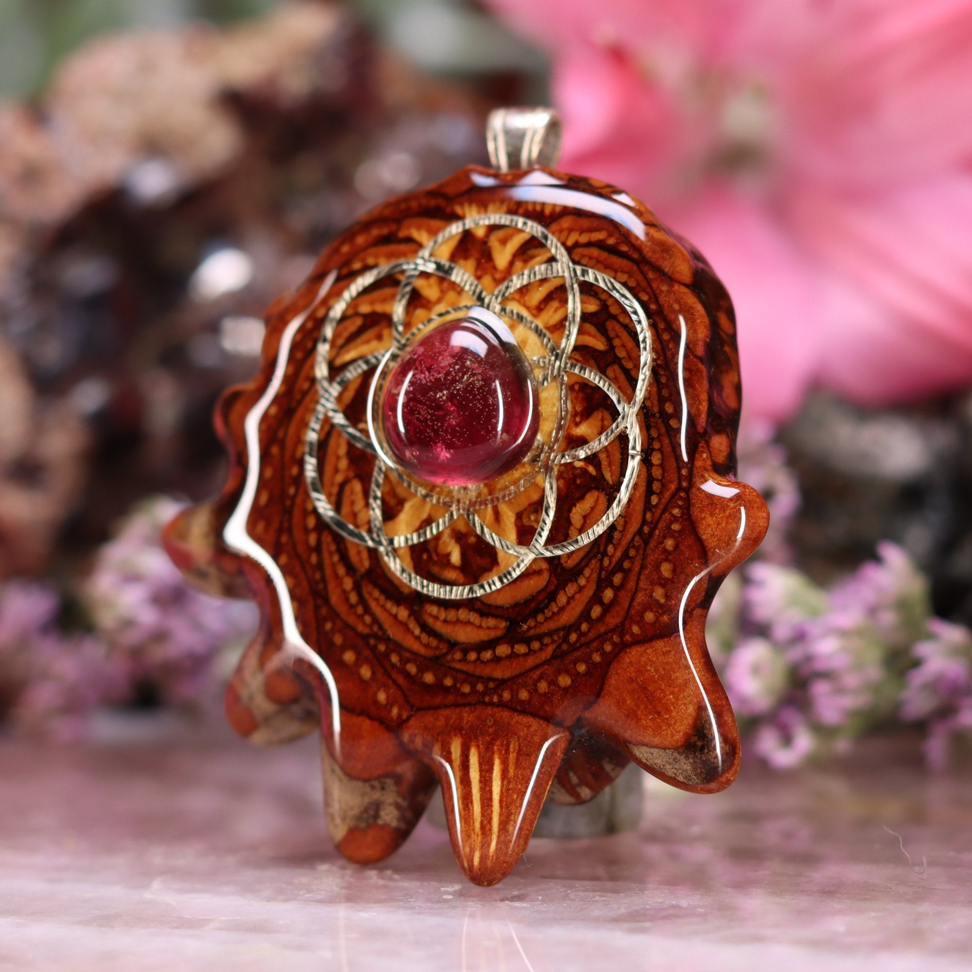 Every pinecone pendant is an elegant gift from Mother Nature -- unveiling the ornate Sacred Geometry hidden at the center of one of the world's densest Pinecones. Because only one cross-section is taken from the "heart" of each Cone, every pendant is absolutely unique, and truly one-of-a-kind.