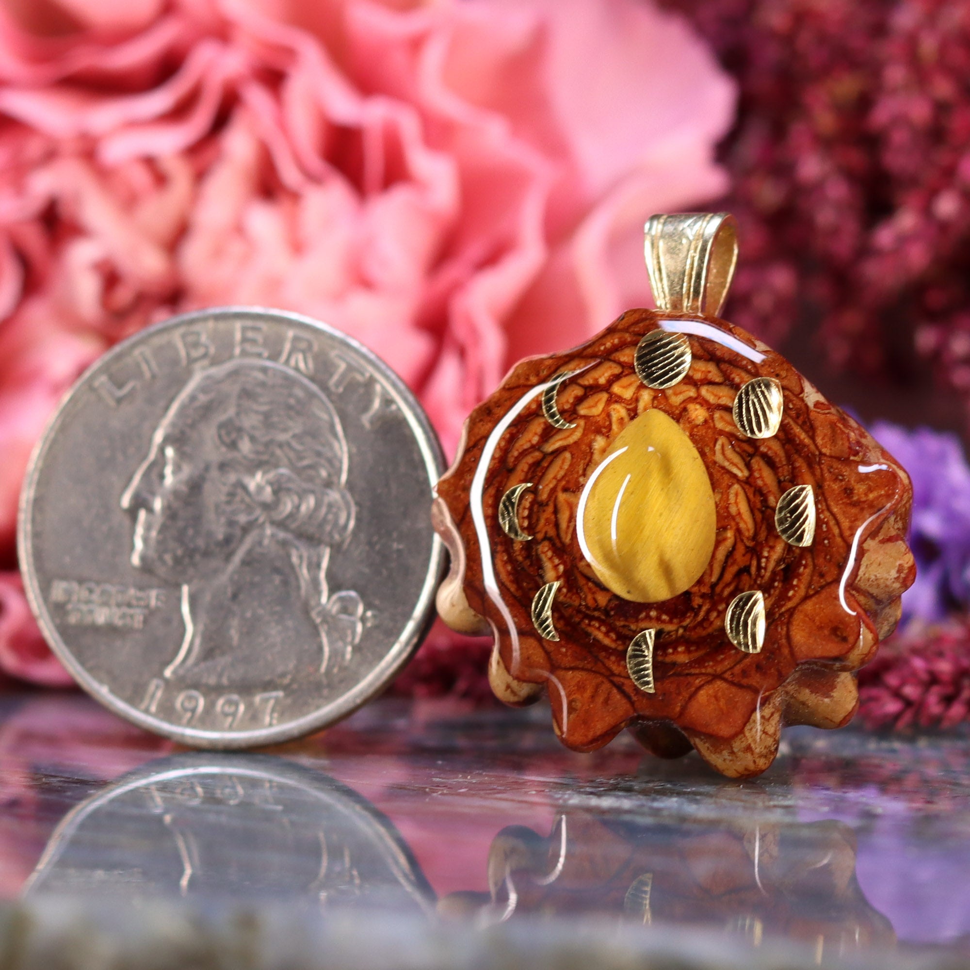 Every pinecone pendant is an elegant gift from Mother Nature -- unveiling the ornate Sacred Geometry hidden at the center of one of the world's densest Pinecones. Because only one cross-section is taken from the "heart" of each Cone, every pendant is absolutely unique, and truly one-of-a-kind.