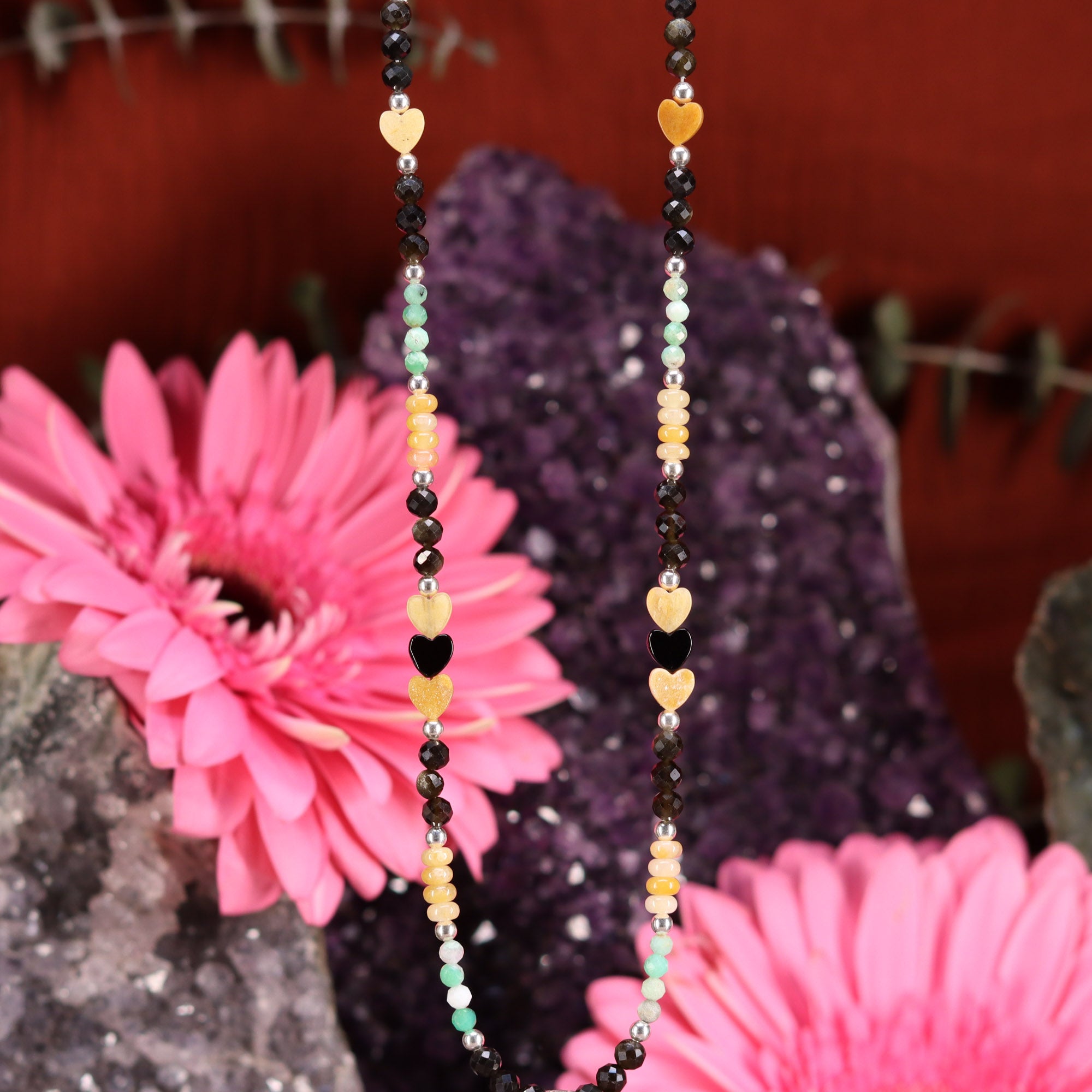 This necklace measures 12.5 inches (32 cm) and features a Yellow Tiger's Eye with Silver Seed of Life pendant lovingly strung with a 4-inch length-adjustable Sterling Silver chain with Obsidian, Variscite, Opal, Onyx, Yellow Jade, and Chrysoprase beads to activate and energize body, mind and spirit!