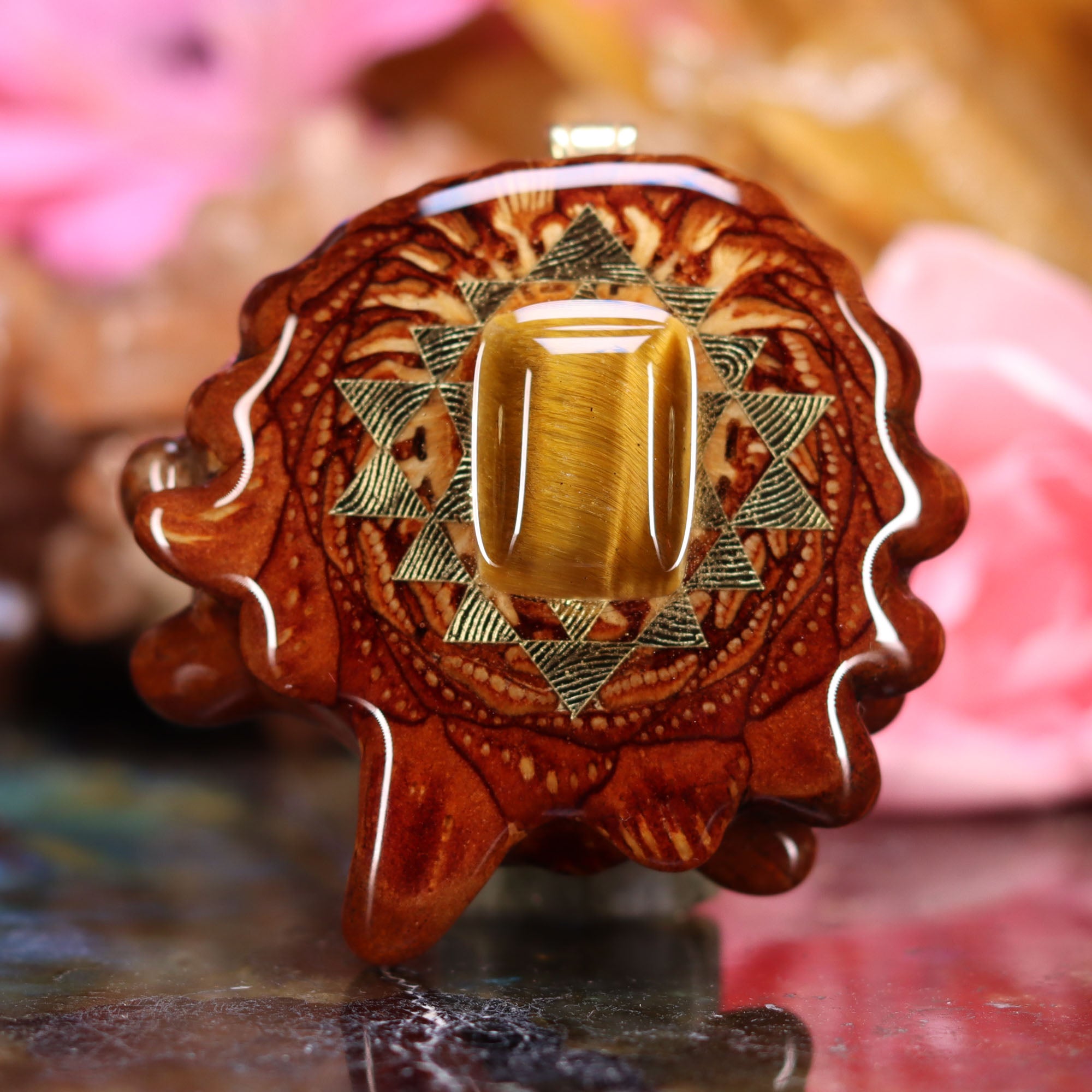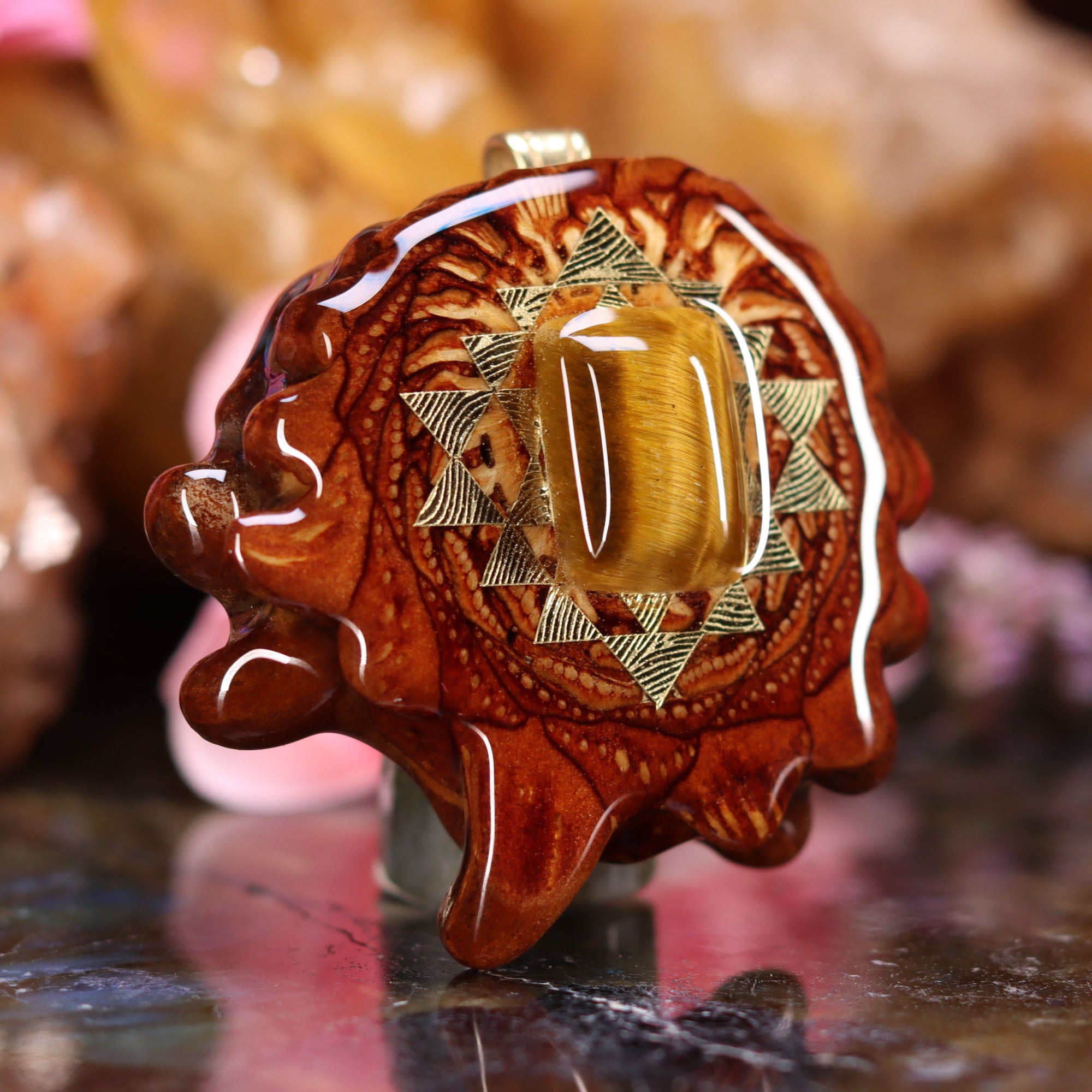 This piece bears a 24k Gold Sri Yantra (literally meaning "holy instrument") Mandala, symbolizing the junction between the physical universe and its unmanifest source according to Hindu Mysticism. Four triangles face upwards to represent the Divine Masculine (Shiva), and five triangles face downwards to represent the Divine Feminine (Shakti). The Sri Yantra is often referred to as the Chakra Raja – King of all Chakras – making it a supreme instrument in the path of spiritual advancement.