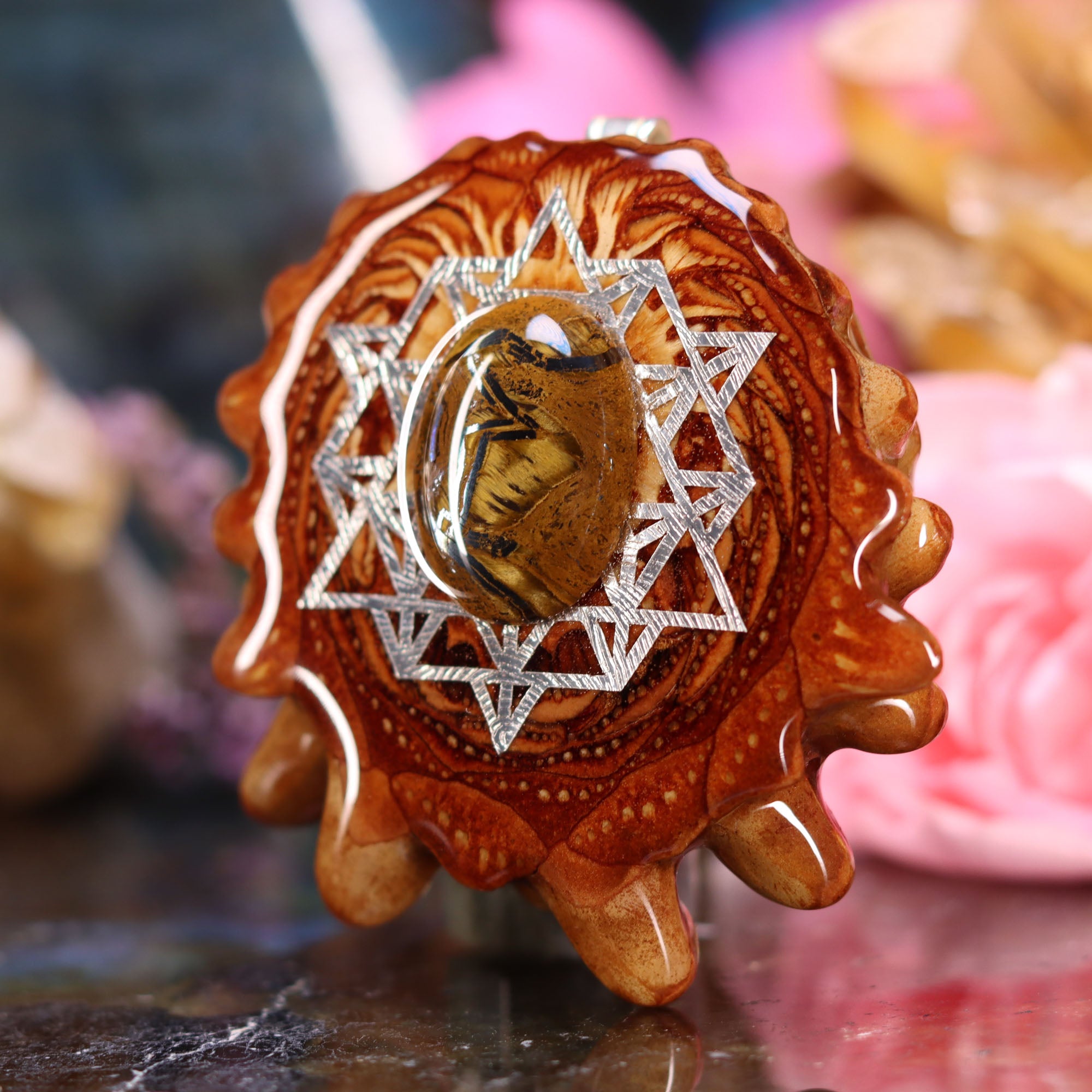 Every pinecone pendant is an elegant gift from Mother Nature -- unveiling the ornate Sacred Geometry hidden at the center of one of the world's densest Pinecones. Because only one cross-section is taken from the "heart" of each Cone, every pendant is absolutely unique, and truly one-of-a-kind.